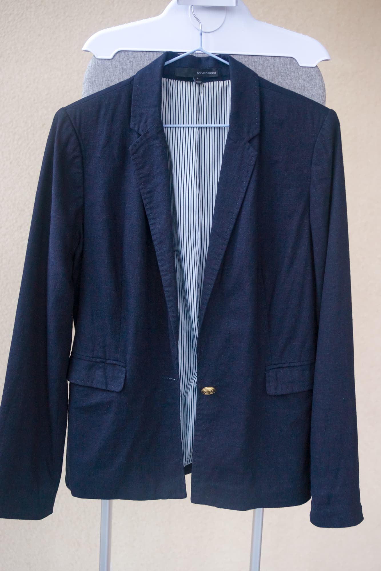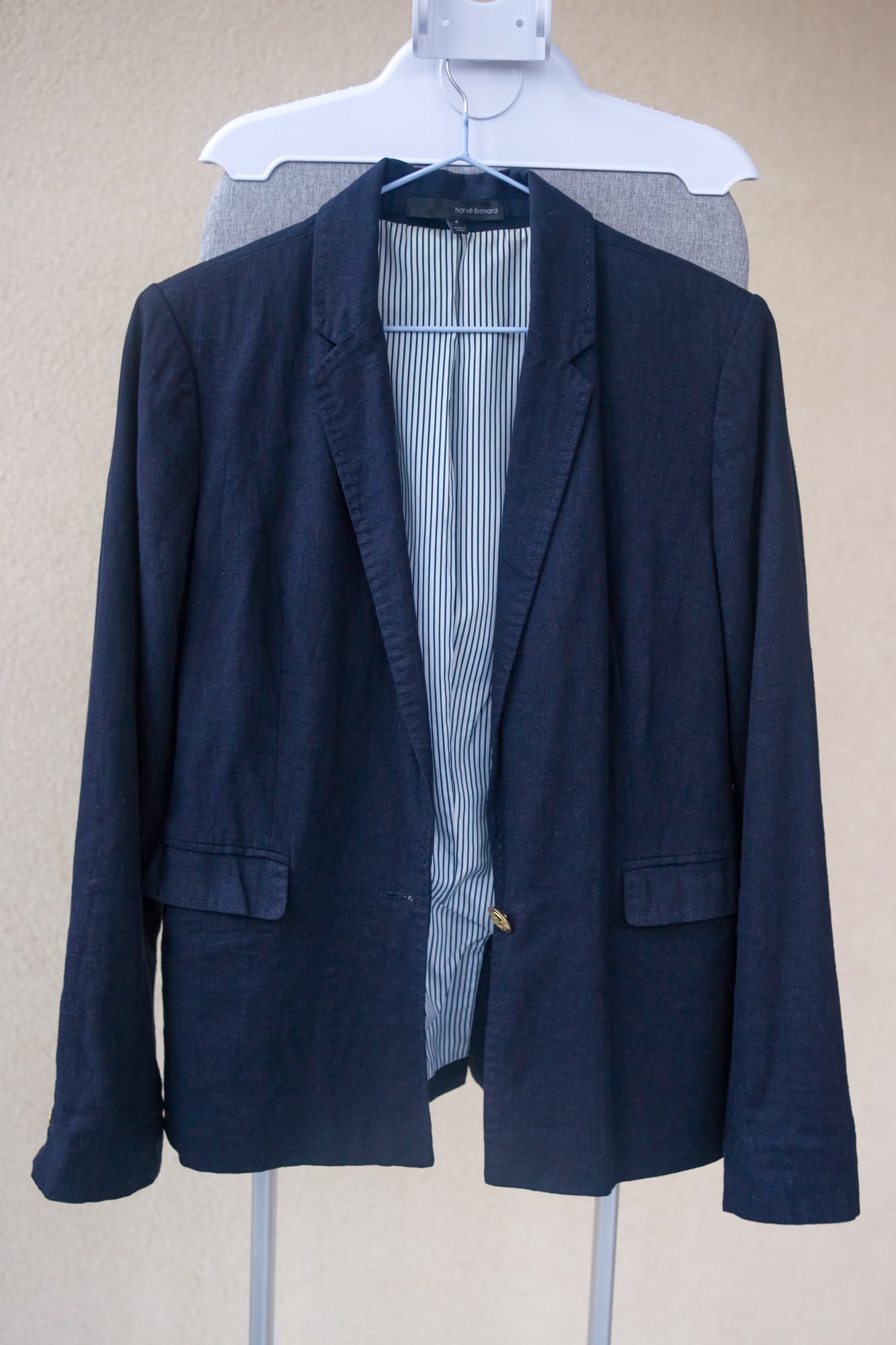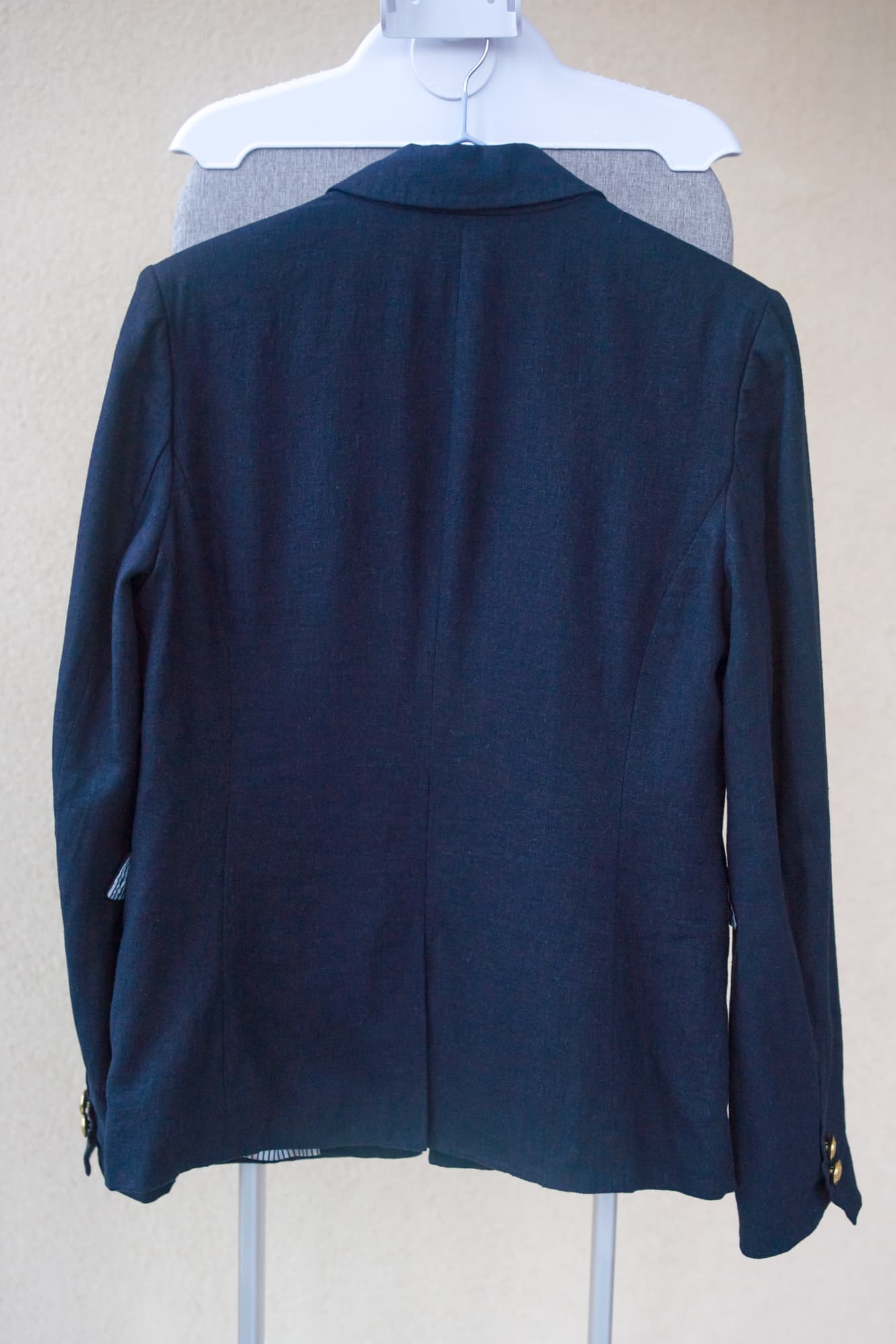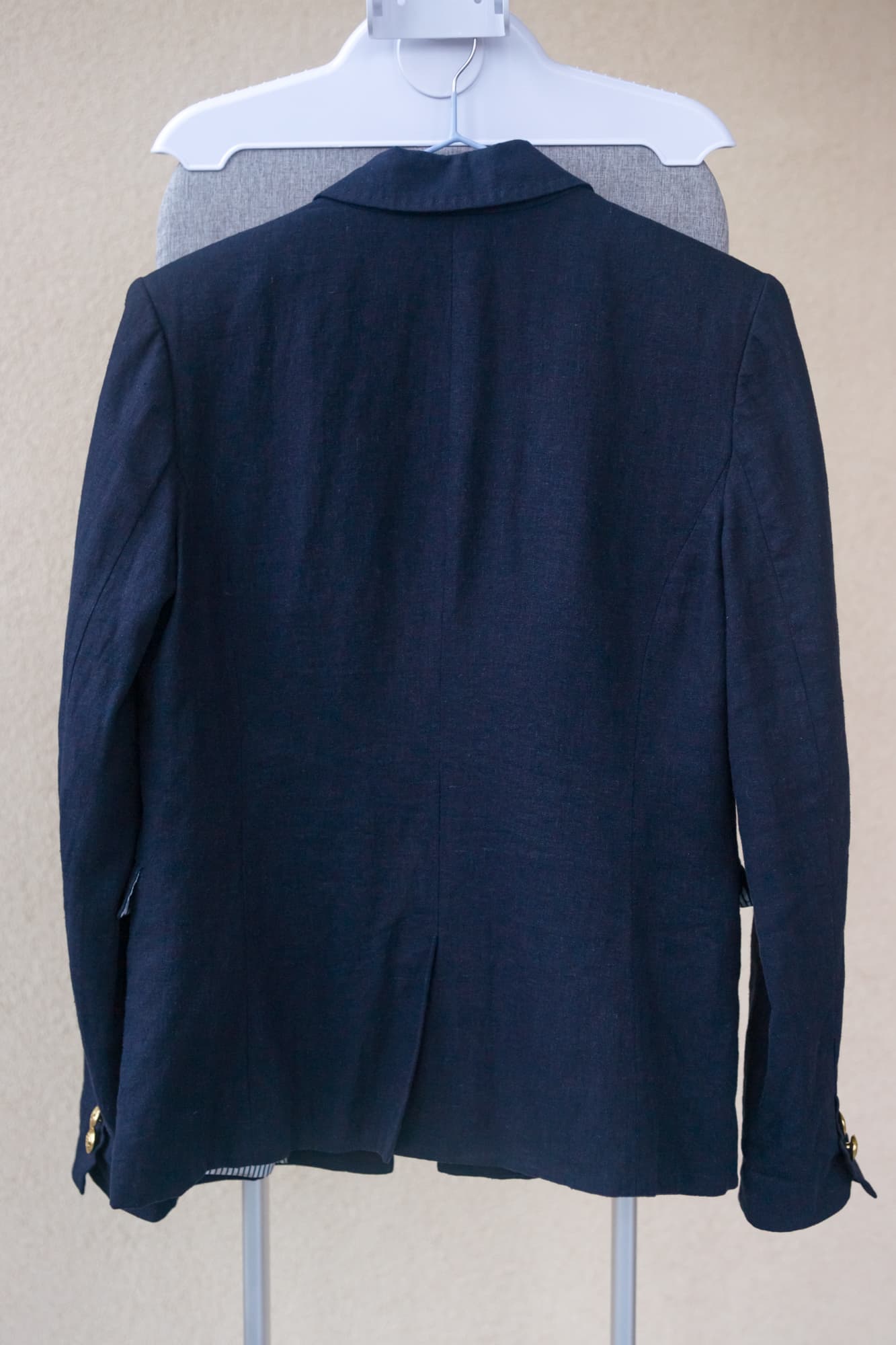 Частично мятый пиджак из смеси хлопка и льна отпаривали на сторонней вешалке, слегка прижимая утюжок к ткани и одновременно натягивая нижний край свободной рукой.