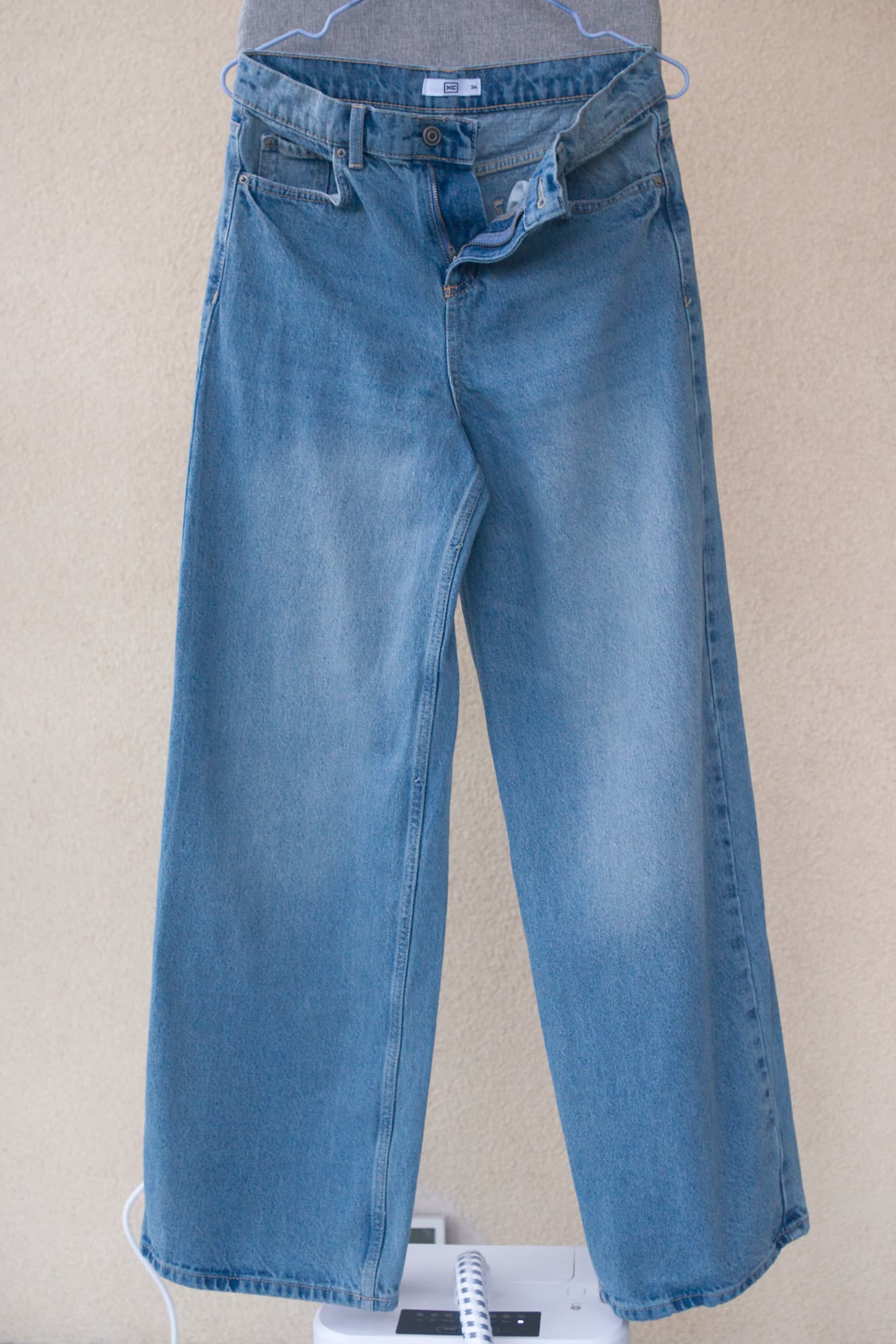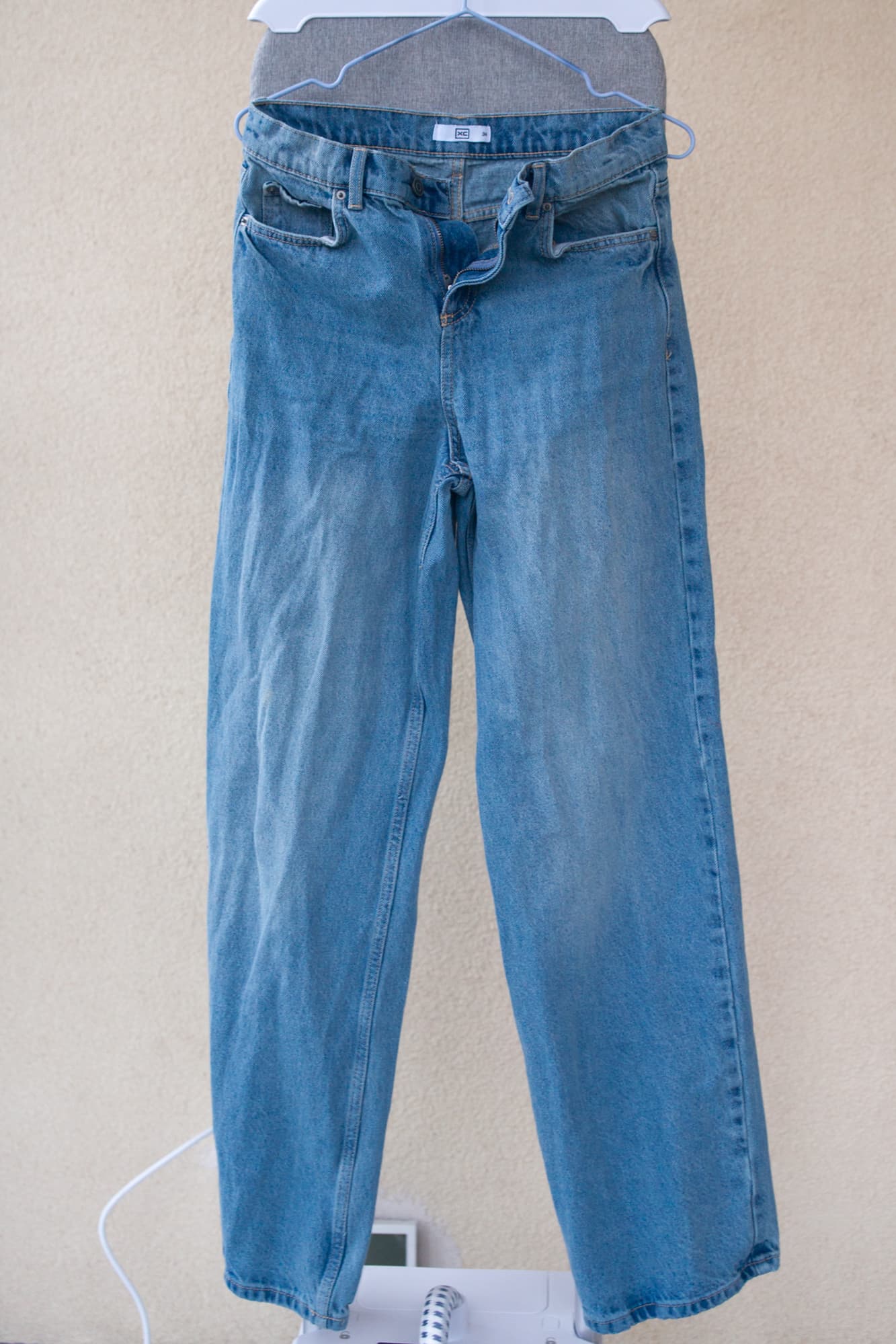 Для удаления заломов с грубой джинсы включили соответствующий режим Деним. Доску оставили в вертикальном положении, чтобы усложнить задачу. Естественно, в области, где можно было прижать ткань к доске с силой, складки разглаживались быстрее, но в целом и на весу, при натягивании нижнего края штанины свободной рукой нам тоже довольно быстро удалось победить замятия.