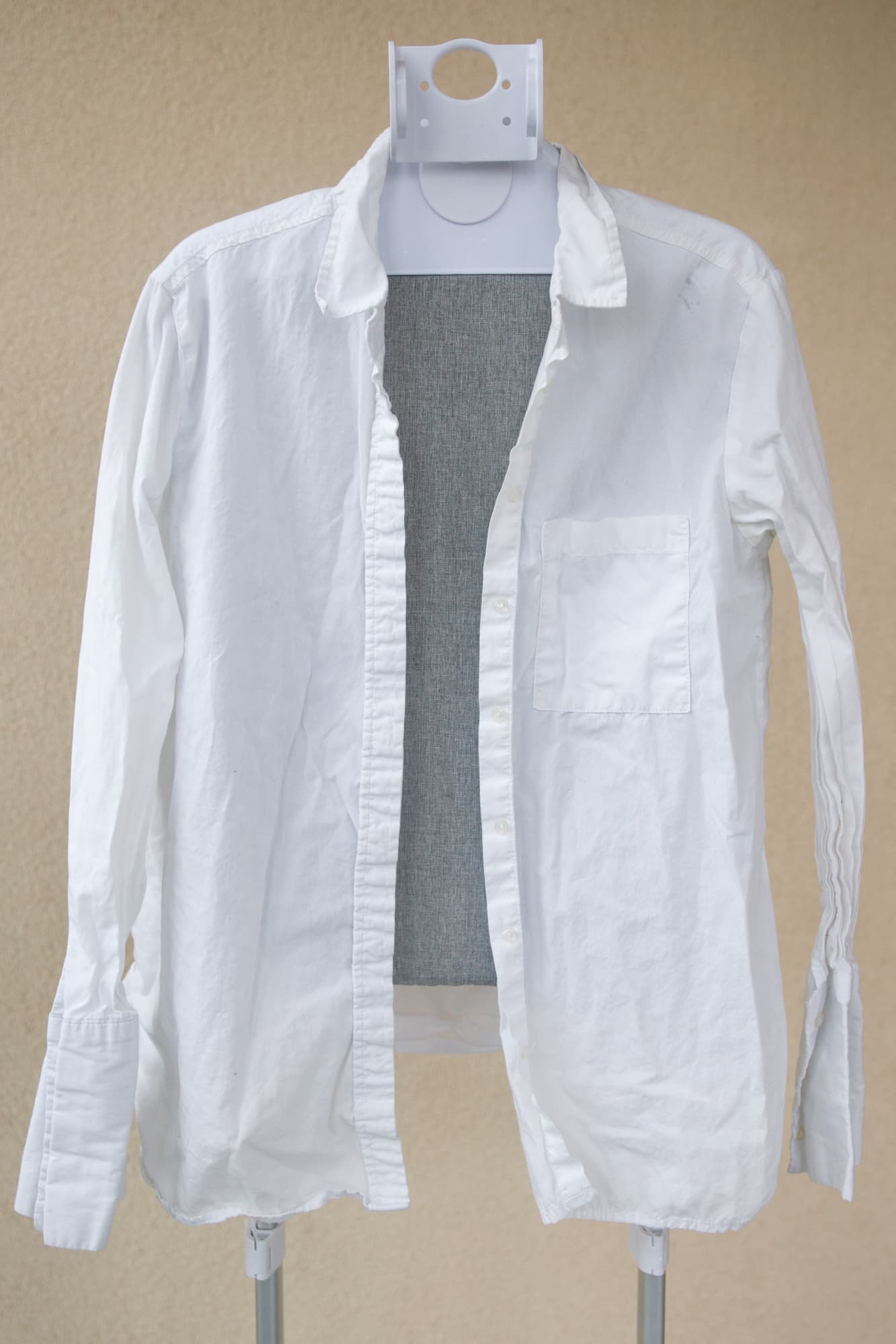 А это задание со звездочкой. Хлопчатобумажная ткань рубашки, которую мы выбрали, не самая плотная и сложная в обработке, но измяли и пересушили мы изделие от души. Включили режим Хлопок. Сначала попробовали отпаривать рубашку на плечиках. Те части, что прижимались к доске, в общем-то разглаживались неплохо. На ткань попали капли воды, но через пару минут все высохло.