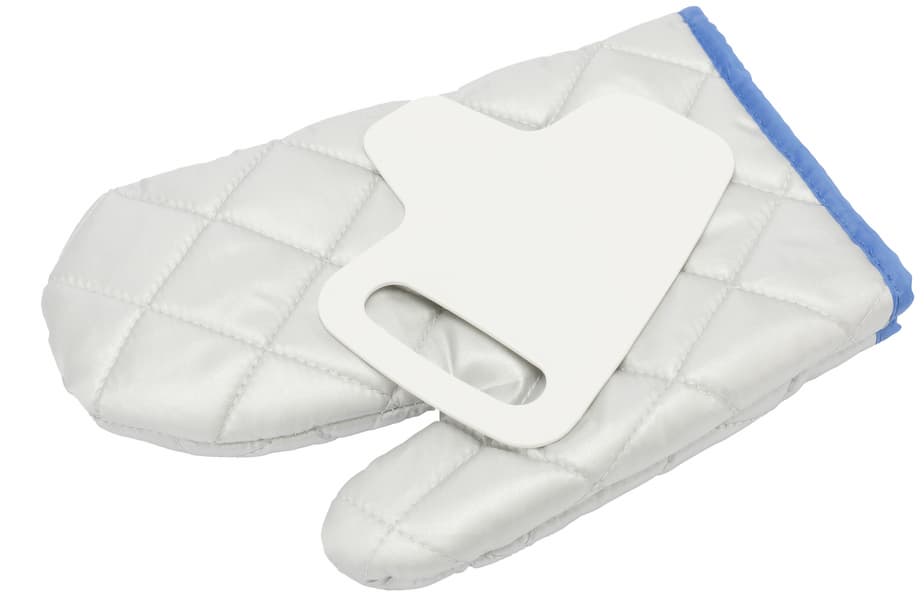 В комплект устройства входят термоварежка из серебристой синтетической ткани и пластина из твердого матового пластика для отпаривания воротников, манжетов и карманов.