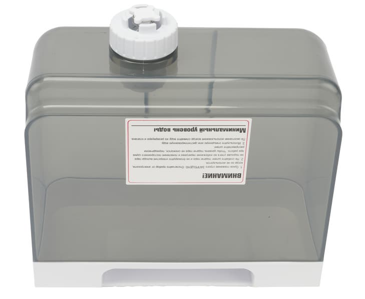 Съемный резервуар из затемненного пластика размещен с тыльной стороны базы. Объем емкости — 2 литра, как и заявлено в паспортных данных. Отметок о максимальном уровне воды нет, есть только о минимальном и нанесена она на наклейку, так что удаляет ее не стоит. К тому же на ней есть полезная информация о работе устройством.