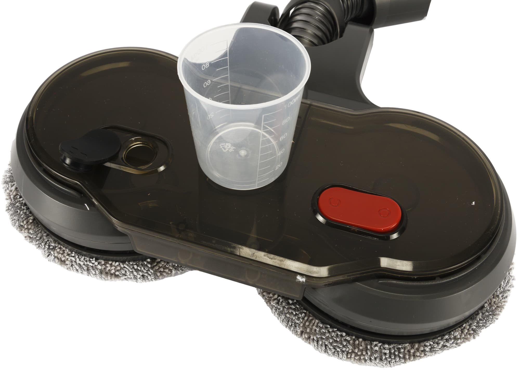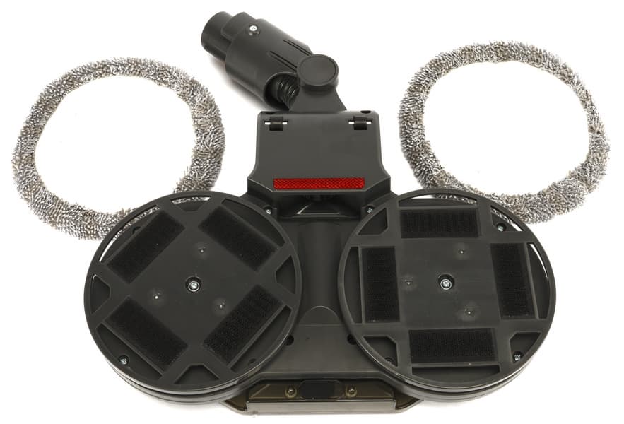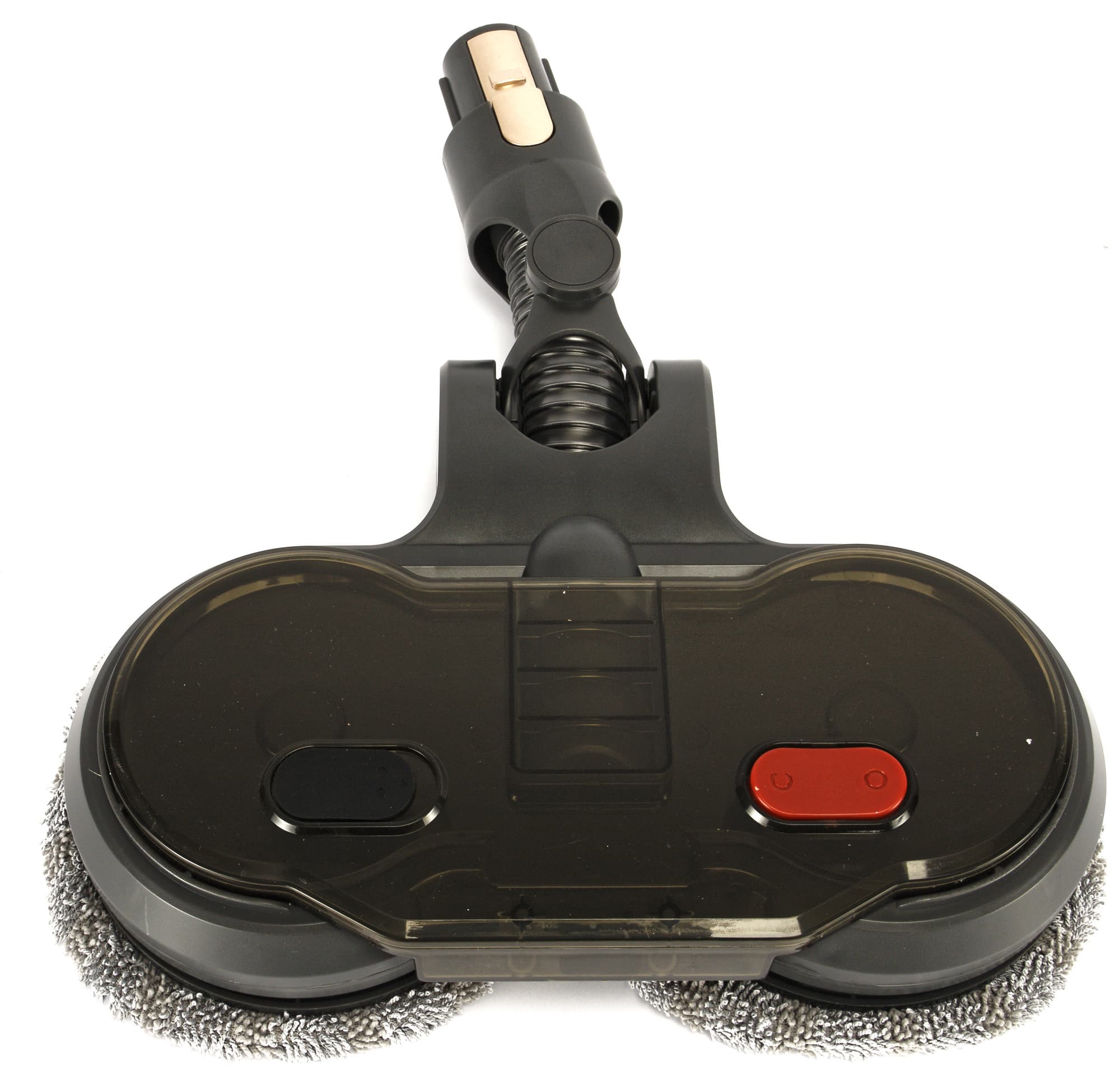 Одно из главных отличий нашей модели от младшей — специальная насадка для мытья пола. В ее верхней части размещен съемный бак для чистой воды, которая поступает на вращающиеся диски-мопы.