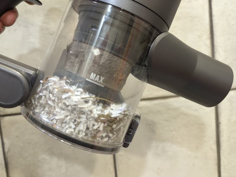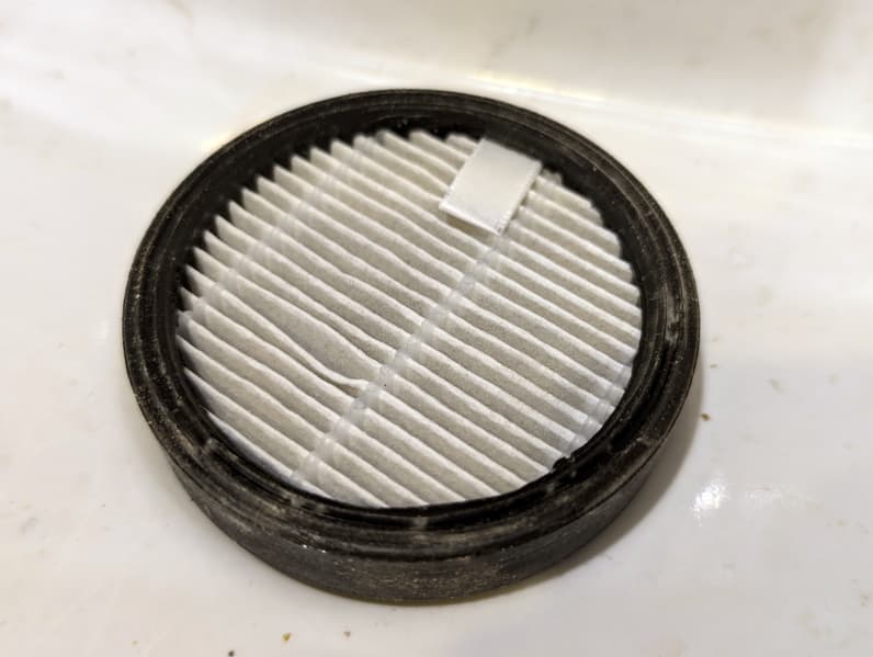 Несмотря на отсутствие предварительного фильтра, до внешней поверхности HEPA-элемента долетает совсем немного пыли: после нескольких интенсивных уборов она лишь слегка потемнела. Внутренняя же сторона осталась почти такой же белой, как в начале эксплуатации. Общее качество фильтрации у Redmond VH1311 Pro Max мы оцениваем как отличное.