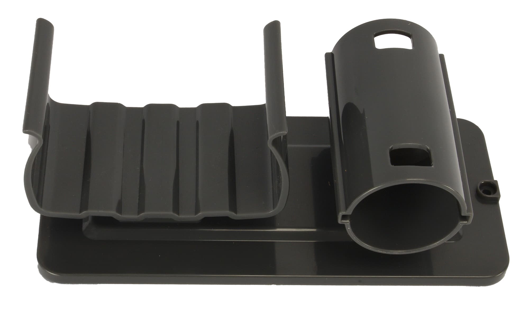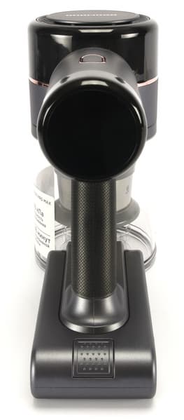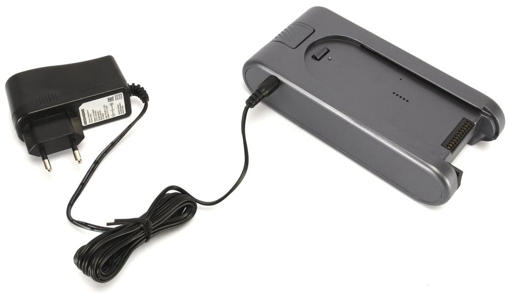 Для хранения и зарядки пылесоса служит подставка с кронштейном, в котором закрепляется моторный блок. В основании базовой станции расположены крепления для четырех наиболее часто используемых насадок.