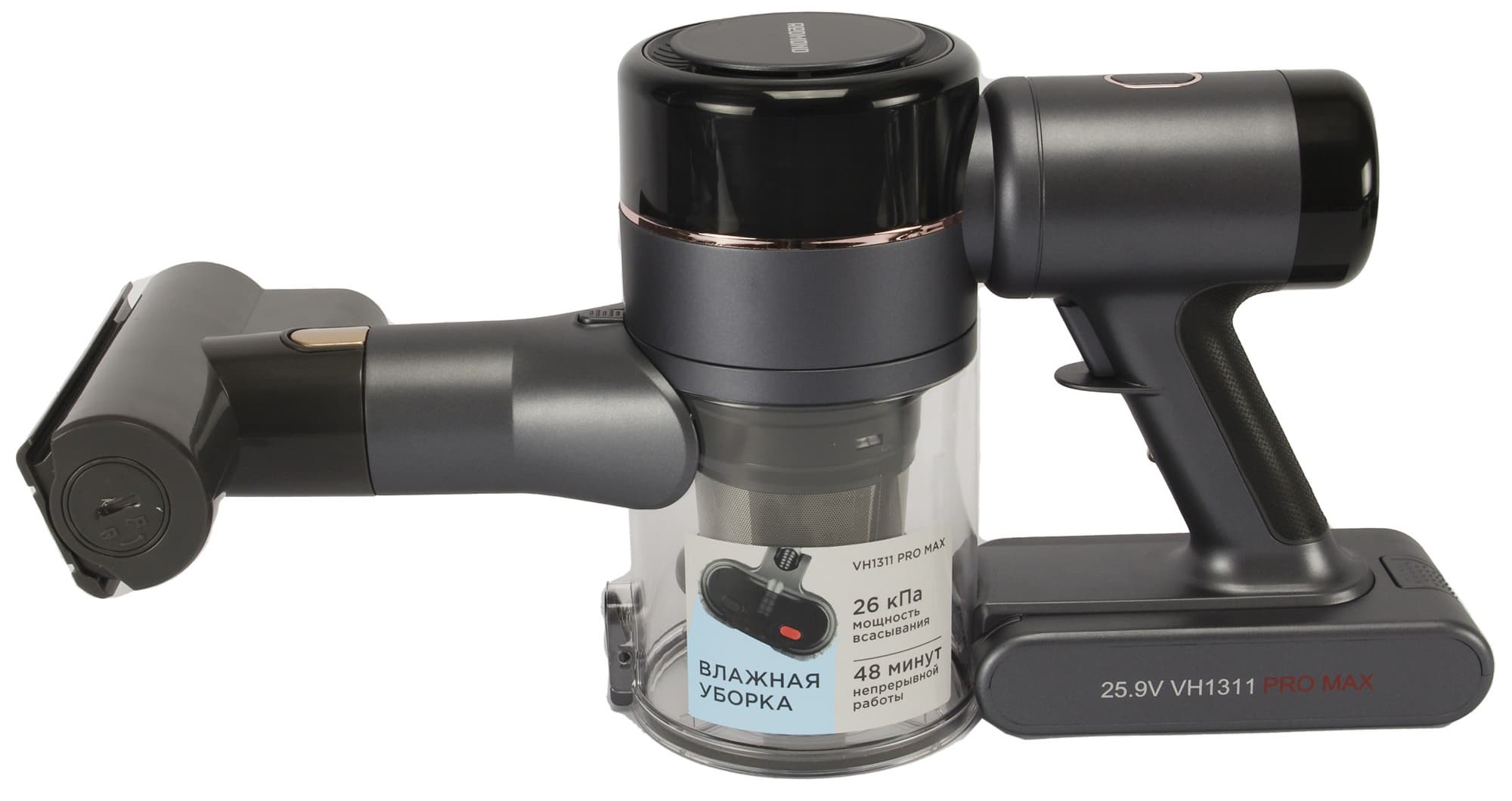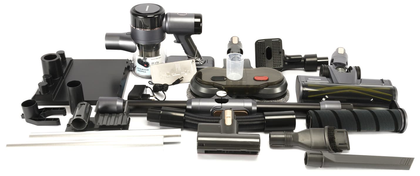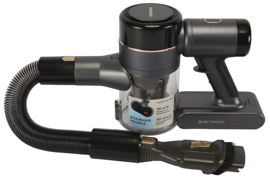 Комплектация у Redmond VH1311 Pro Max весьма богатая: в поставку входят две насадки для сухой и влажной уборки пола, электрощетка для мягкой мебели, две традиционные немоторизованные насадки и даже специальная щетка для вычесывания животных. Производитель не забыл добавить гибкий гофрированный шланг, облегчающий уборку в труднодоступных местах, а также позаботился об удобном хранении устройства с аксессуарами.
