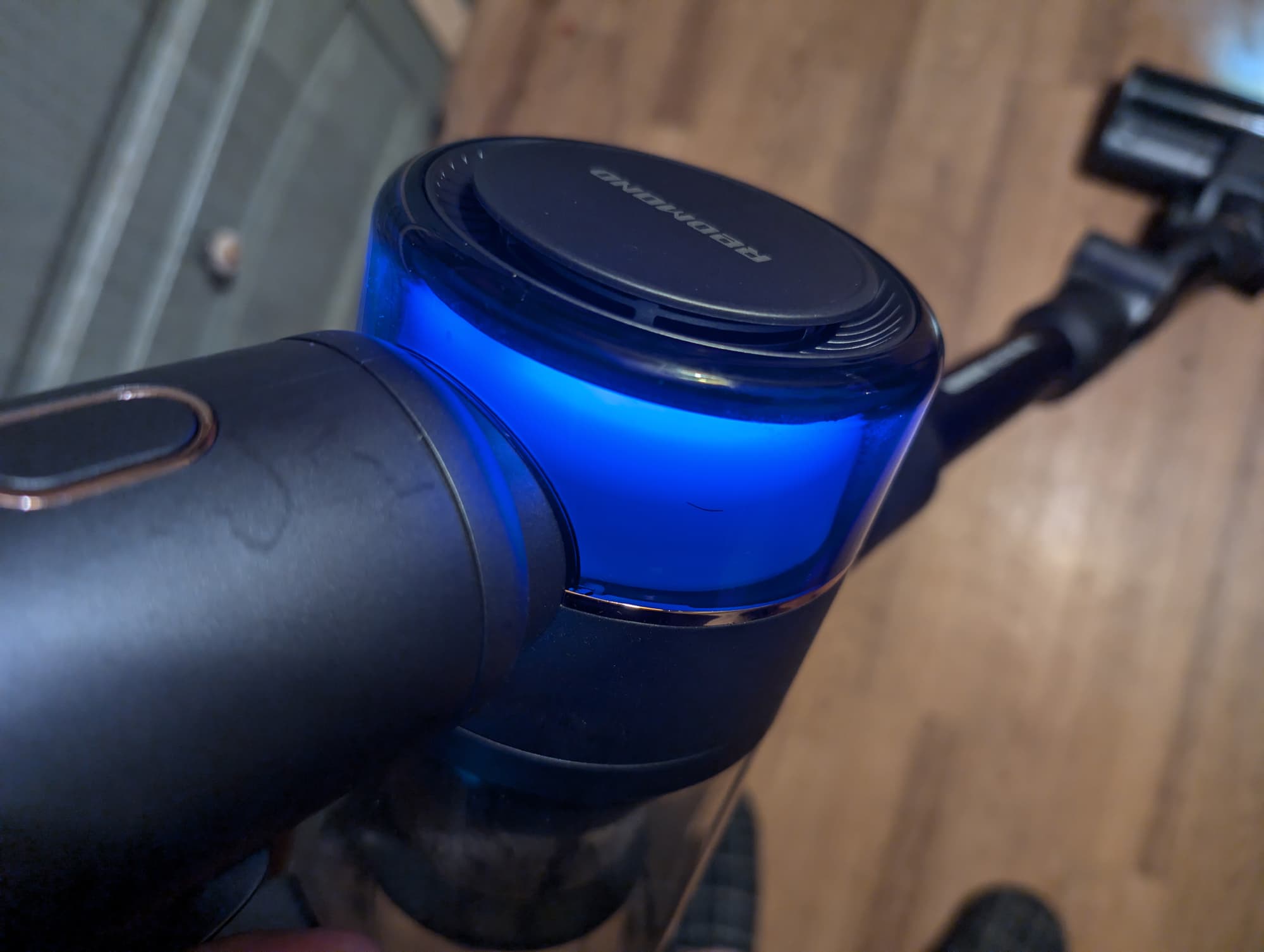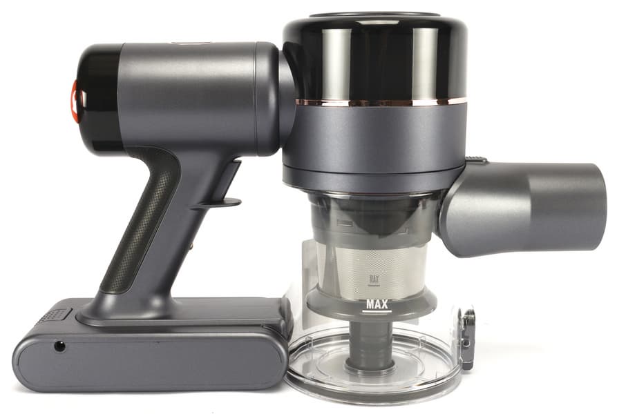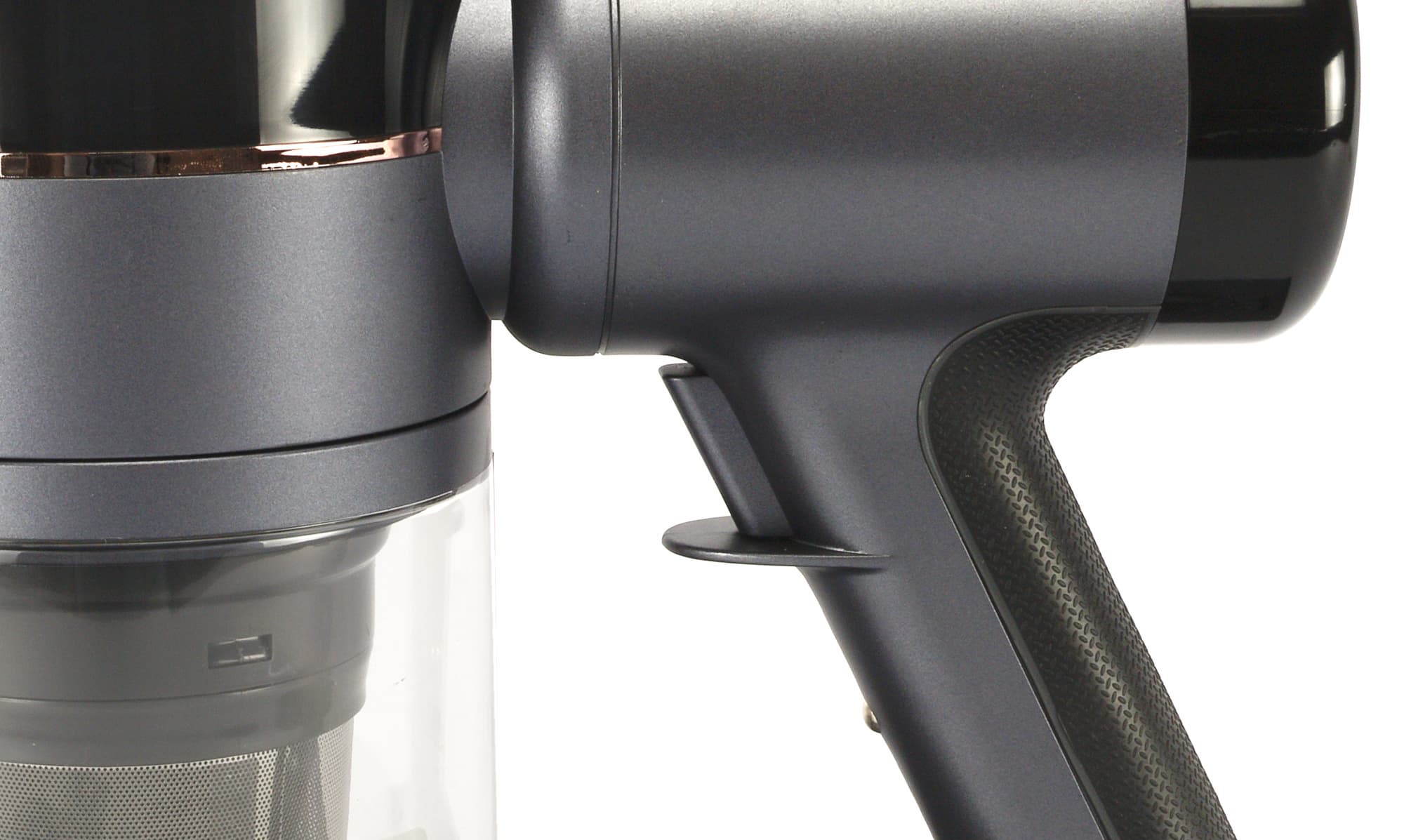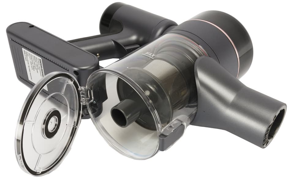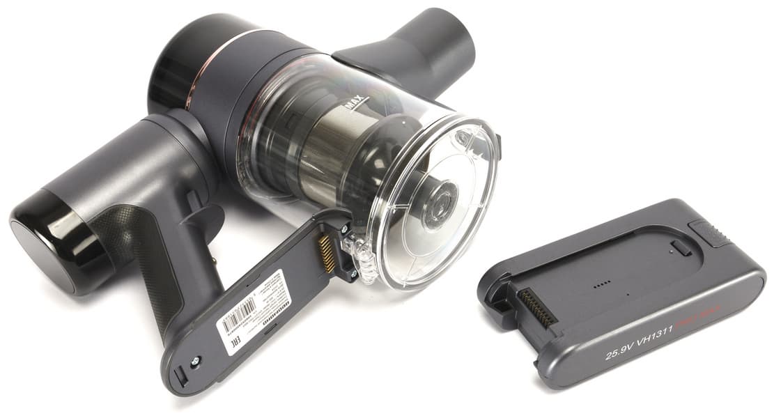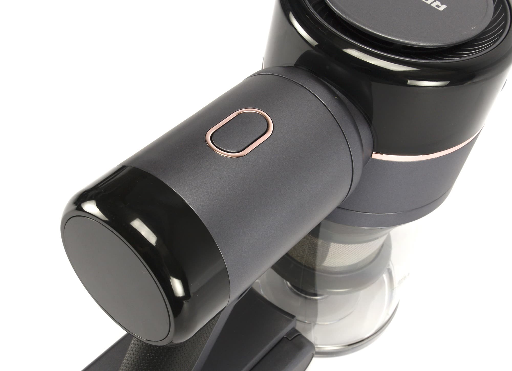 Циклонный фильтр с контейнером для мусора расположен перпендикулярно воздушному тракту. Над ним — моторный отсек из гладкого темного пластика. Под декоративным колпаком скрывается модуль цветной подсветки, сообщающей пользователю об уровне заряда аккумулятора.