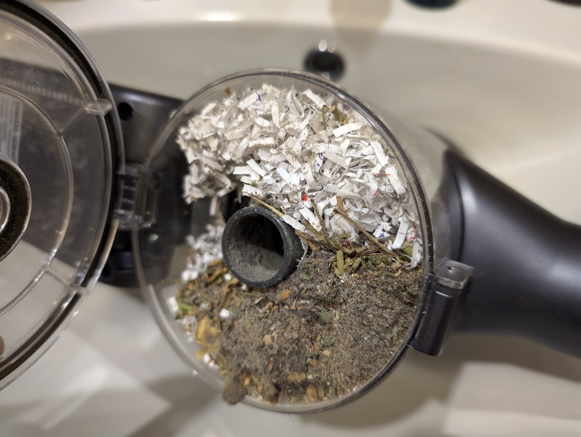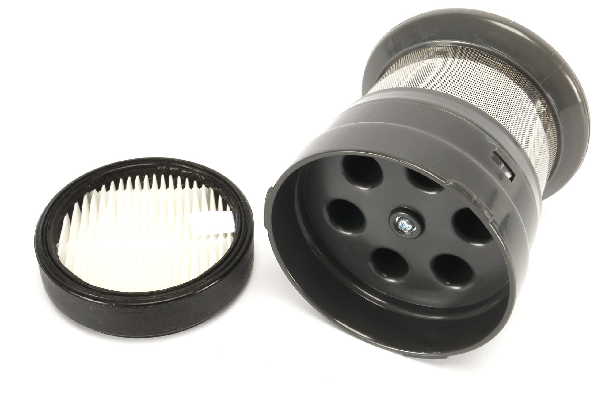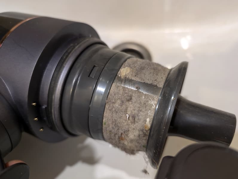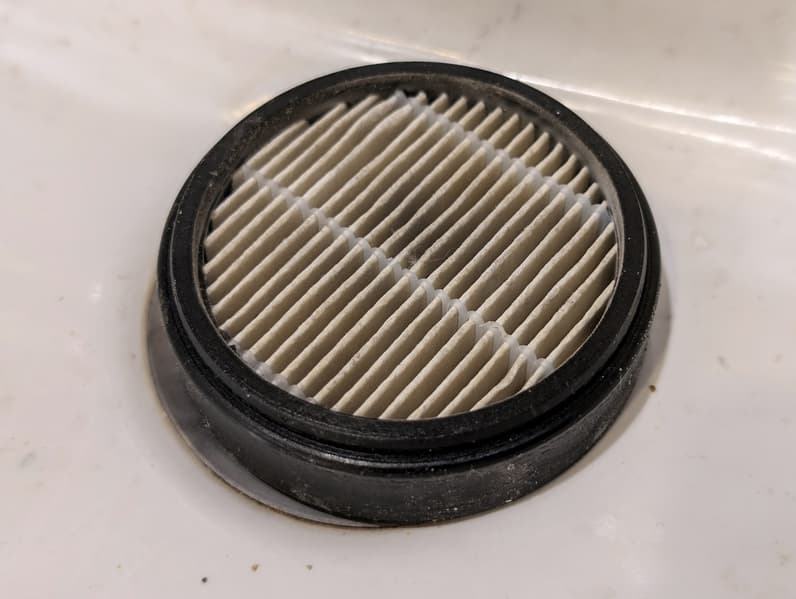 Тяжелый и крупный мусор задерживается в нижней части контейнера, за фильтрацию средней фракции отвечает стальная сетка с микроперфорацией, а за тонкую очистку — дисковый HEPA-элемент. Предварительного фильтра перед диском мы не обнаружили.