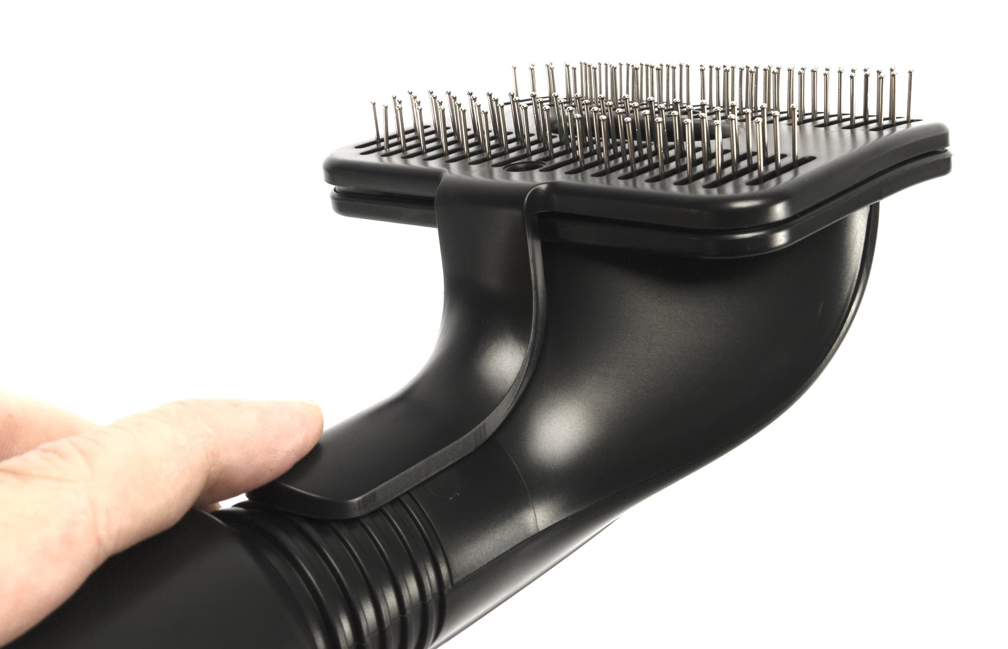 При нажатии на рычаг из платформы выступают металлические элементы с закруглениями на концах. Такая «щетина» эффективно собирает шерсть, не травмируя животное, а для всасывания собранного достаточно отпустить рычаг: платформа вернется в исходное положение, а вычесанные пух и подшерсток отправятся в воздушный тракт пылесоса.