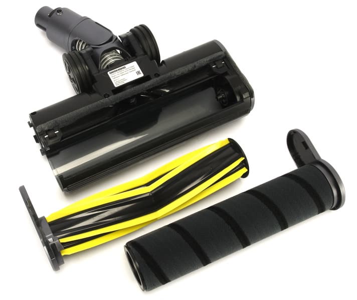 Роторная щетка для уборки ковровых покрытий — с тремя парами V-образных жестких ламелей контрастного цвета. У модели VH1311, как мы помним, конструкция ротора была сильно проще.