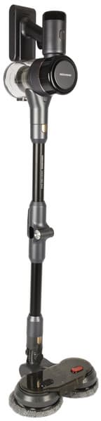 Остались довольны мы и знакомством с моторизованной насадкой для влажной уборки — конструкцией, которую мы раньше не встречали в вертикальных пылесосах. Вращающиеся диски-мопы обеспечивают значительно более качественную протирку пола, нежели традиционные неподвижные салфетки, с их помощью можно быстро удалить стойкие и застарелые загрязнения.