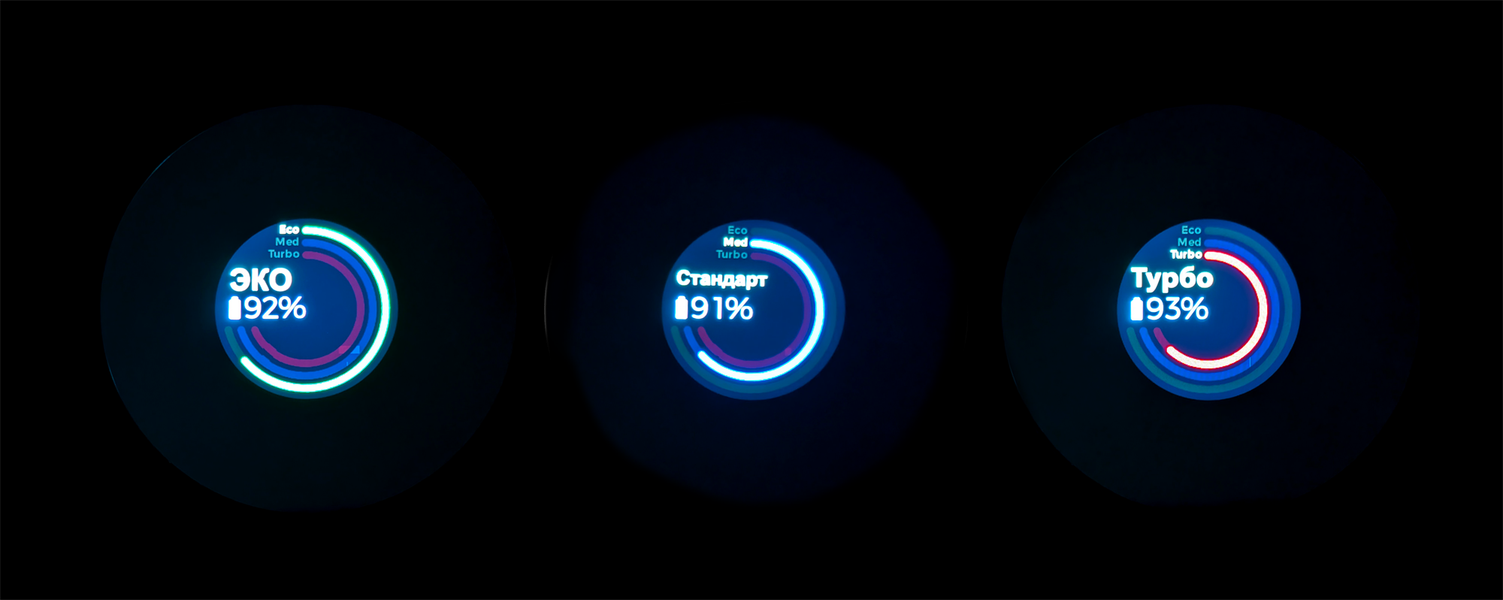 О состоянии батареи информирует пользователя и цветная подсветка моторного блока: в диапазоне от 100% до 75% она светится синим, от 74% до 40% — фиолетовым, а когда уровень заряда падает ниже 40%, зажигается предупреждающий красный сигнал.