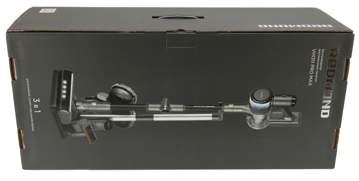 Вертикальный аккумуляторный пылесос Redmond VH1311 Pro Max поставляется в темно-серой коробке с пластиковой ручкой. Фирменный дизайн Redmond узнается с первого взгляда.