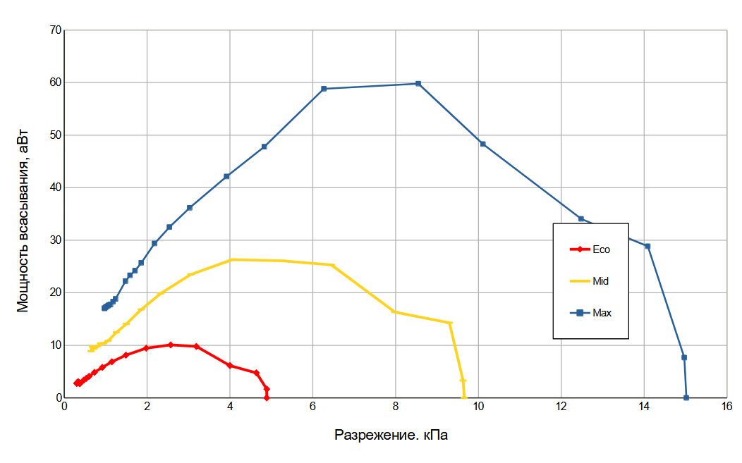 Мощность всасывания (что это такое и как мы ее измеряем, описано в отдельной статье) мы определяли при работе пылесоса без трубы и насадок, в обоих режимах. Зависимость мощности всасывания от создаваемого разрежения приведена на графике ниже: