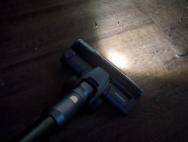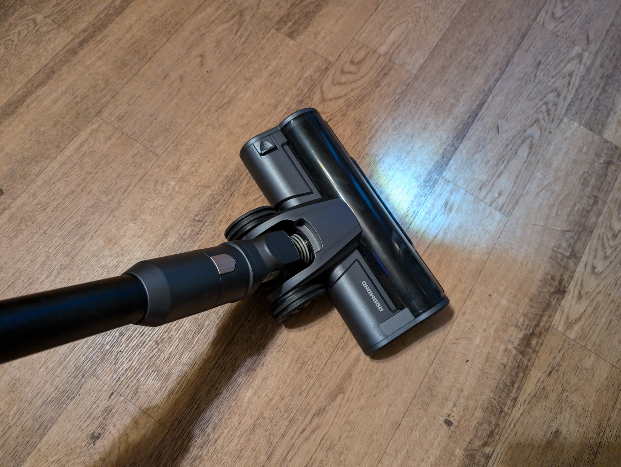 В конфигурации для сухой уборки пылесос не вызвал ни малейших нареканий: он хорошо сбалансирован, удобно лежит в руке, подвижность насадки обеспечивает легкий доступ в труднодоступные места, а у самой щетки есть парковочное положение, позволяющее поставить устройство вертикально при паузах в работе.