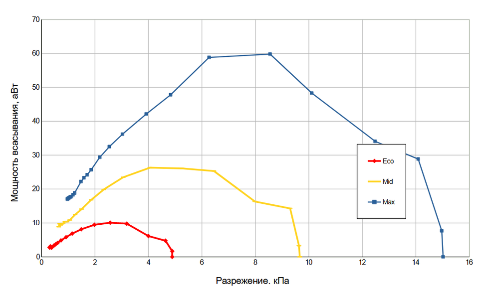 Измеренная нами мощность всасывания составила 59,8 аВт в максимальном режиме, 26,3 аВт — в среднем, и 10,1 аВт — в минимальном.