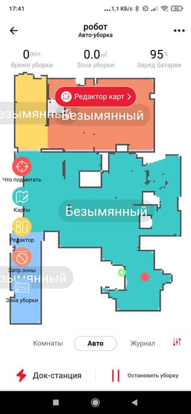 В нижней части находятся кнопки «Комната» (уборка в отмеченных помещениях), «Авто» — автоматическая уборка, «Журнал» — просмотр истории уборок. Во время уборки вместо них появляются кнопки «док-станция» (возврат на базу) и «Остановить уборку».