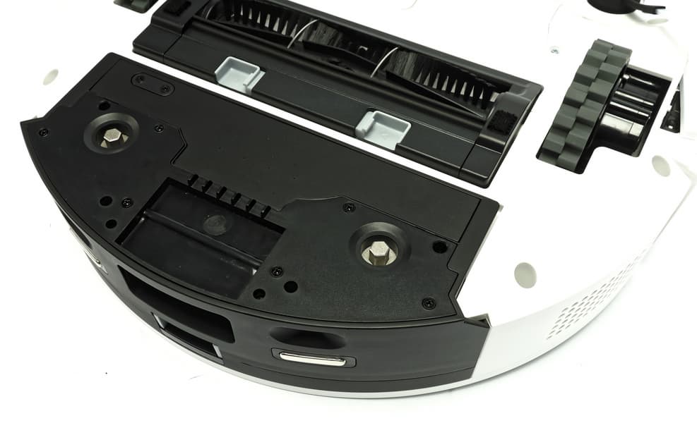Комбинированный модуль для сухой и влажной уборки расположен в задней части робота. Он, как водится, фиксируется на своем месте с помощью кнопки-защелки.