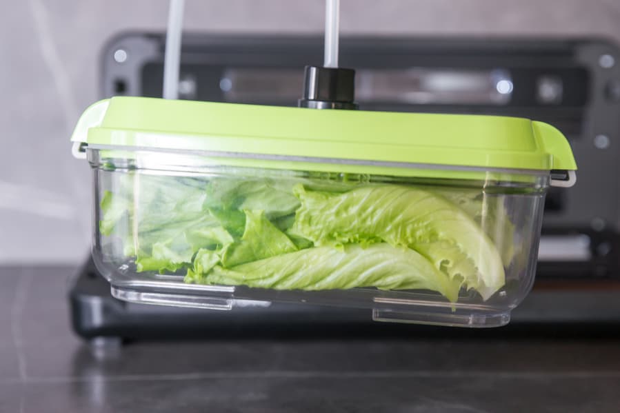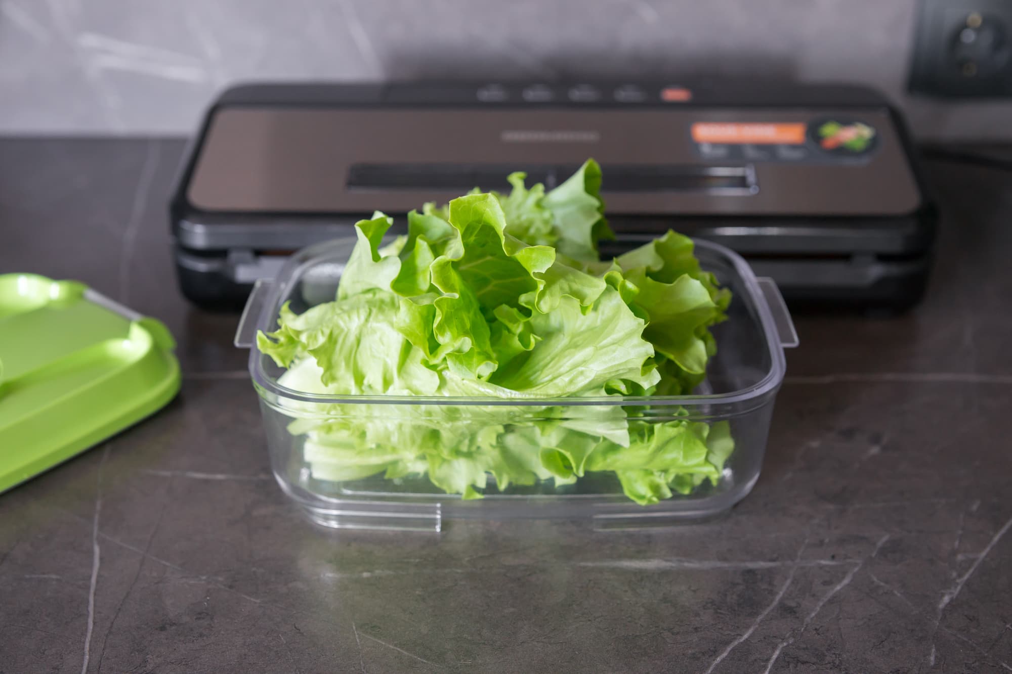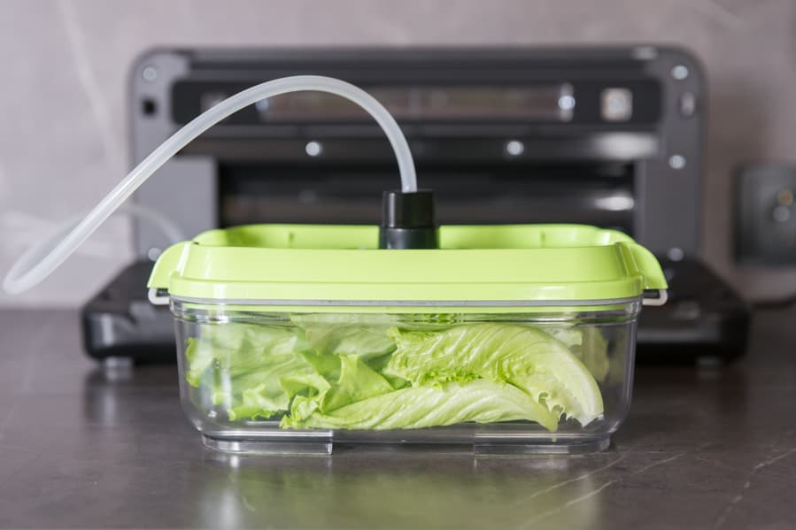 Листья помыли, просушили, сложили в специальный контейнер и завакуумировали при помощи комплектного насоса. Откачка воздуха заняла всего секунд 10. Судя потому, что емкость легко можно было поднять за шланг и крышка ни в какую не открывалась — воздух был удален по максимуму.