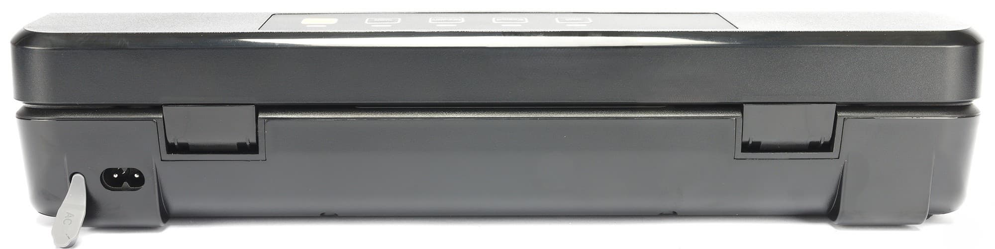 Симпатичный компактный вакууматор в основном выполнен из черного пластика. На верхней панели — вставка из нержавеющей стали. Механические кнопки управления расположены по центру верхней панели ближе к тыльной стороне корпуса.