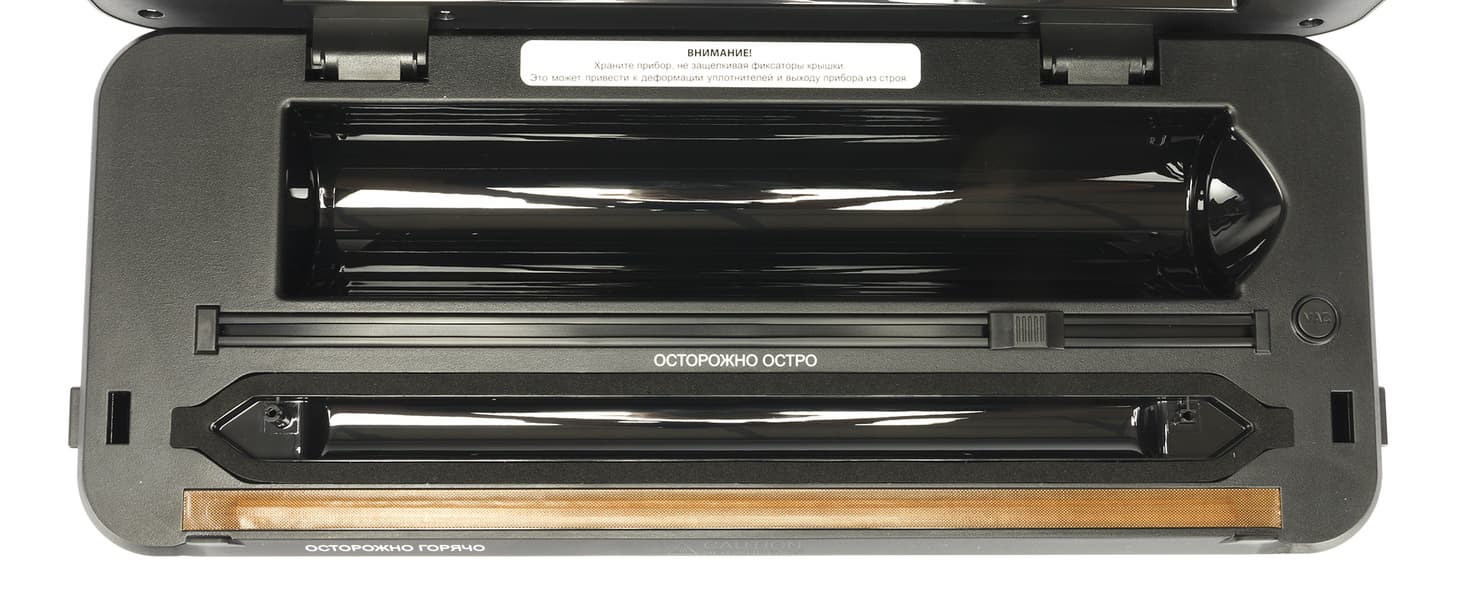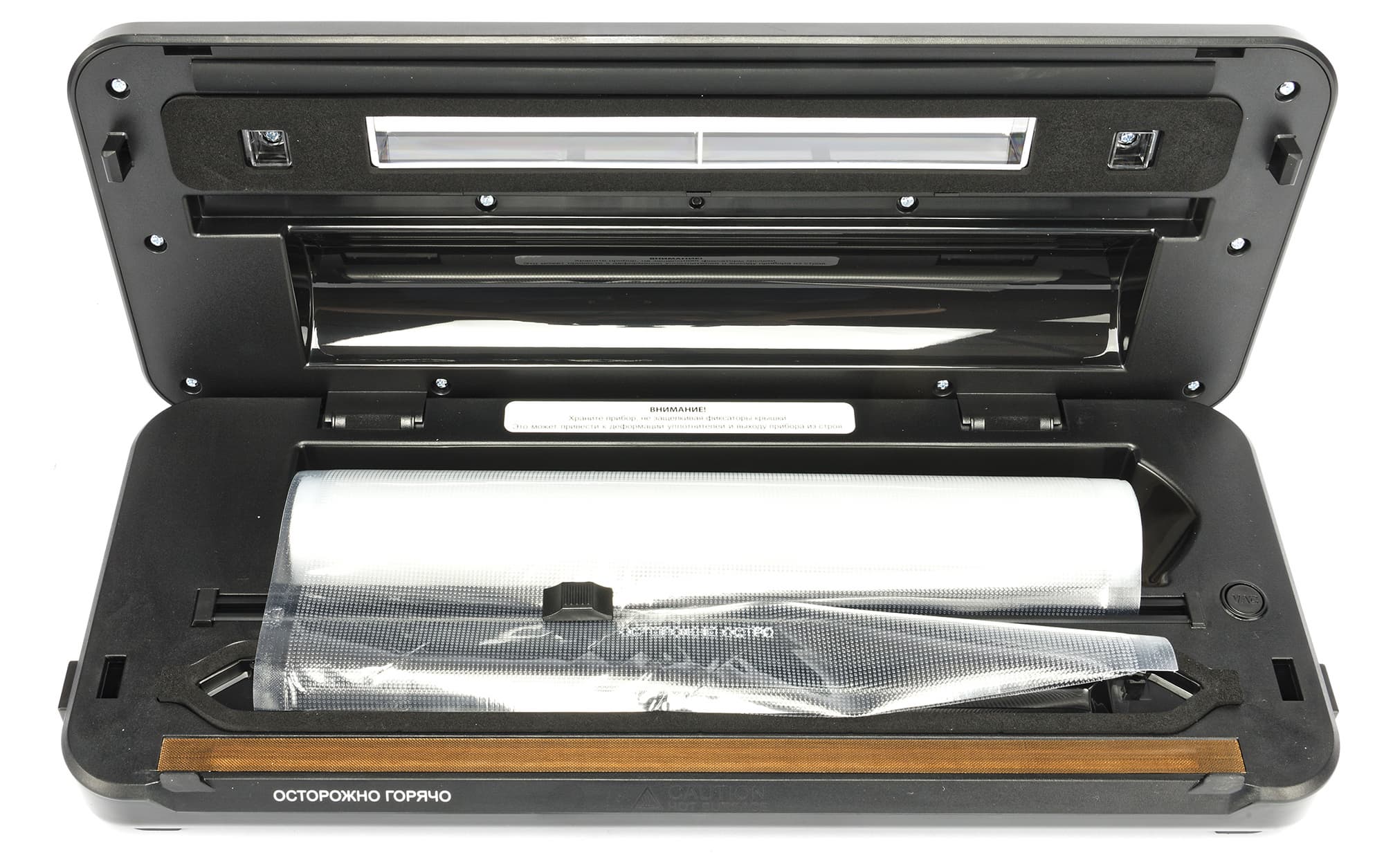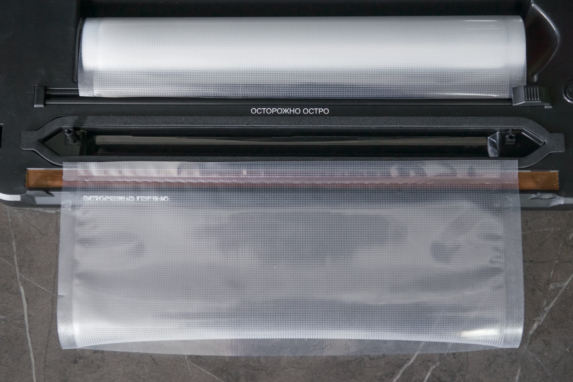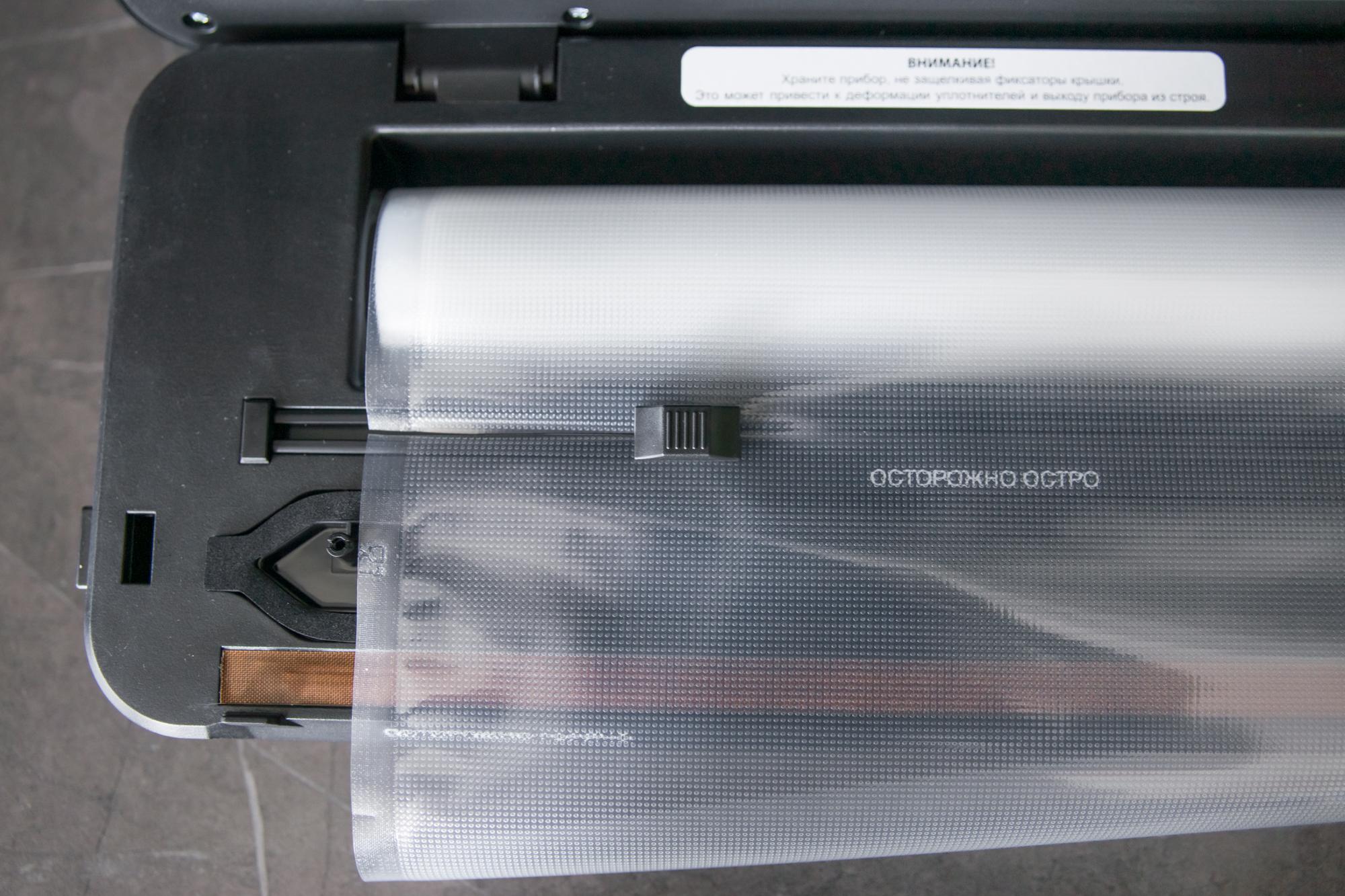 Выше в специальном отсеке размещен комплектный рулон (28×300 см), который можно нарезать на пакеты необходимой длины, не вынимая из корпуса, при помощи встроенного резака.