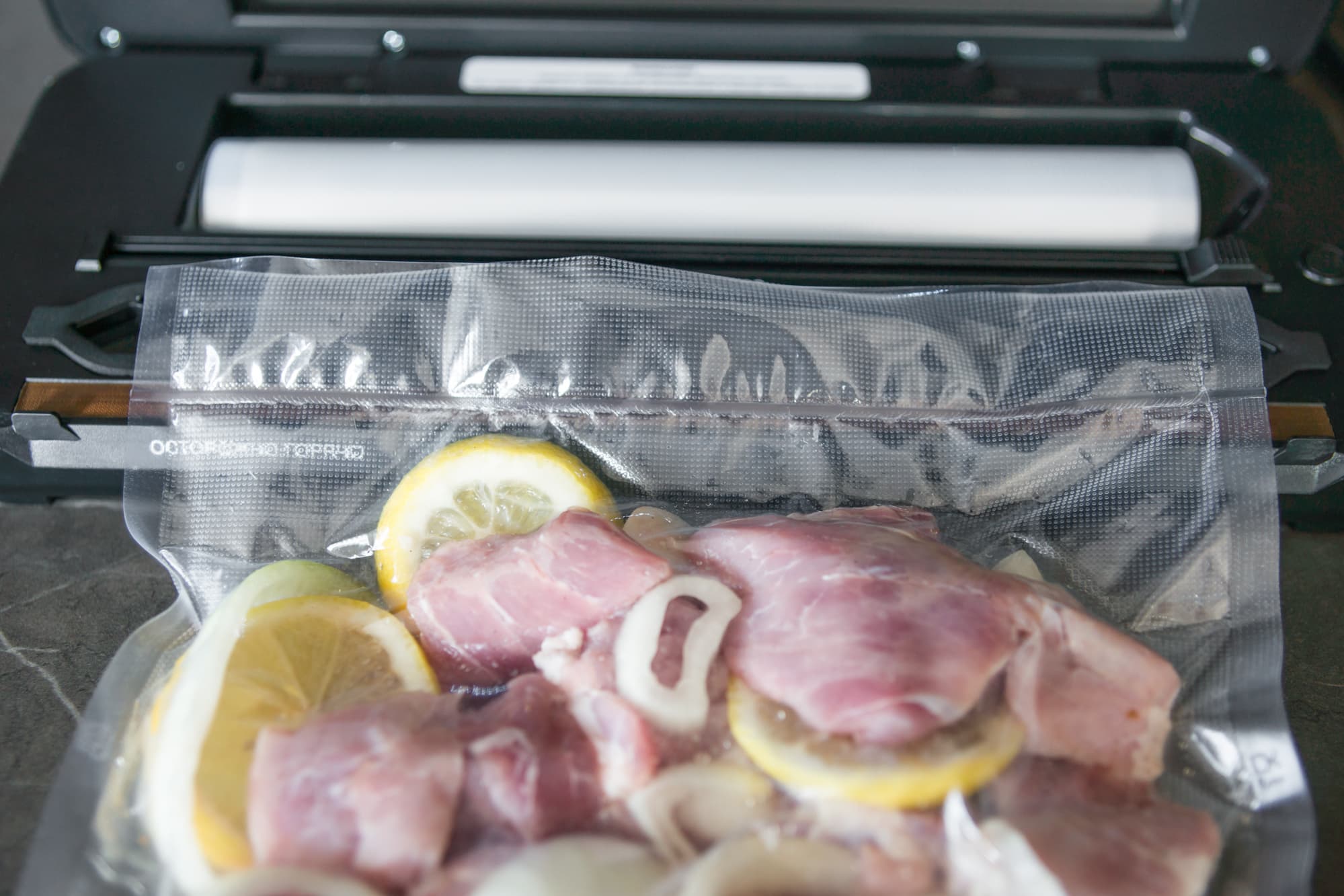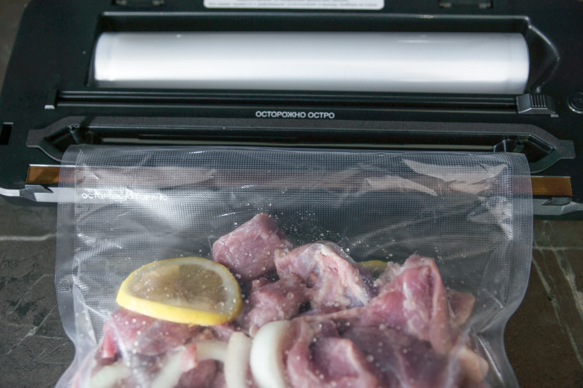 Для вакуумации в подготовленный пакет с запаянным дном укладываем продукты, затем также помещаем незапаянный конец по центру вакуумной камеры, закрываем крышку и включаем кнопку необходимого режима. Напомним, для качественного запечатывания шва, края пакета должны абсолютно сухими и чистыми.