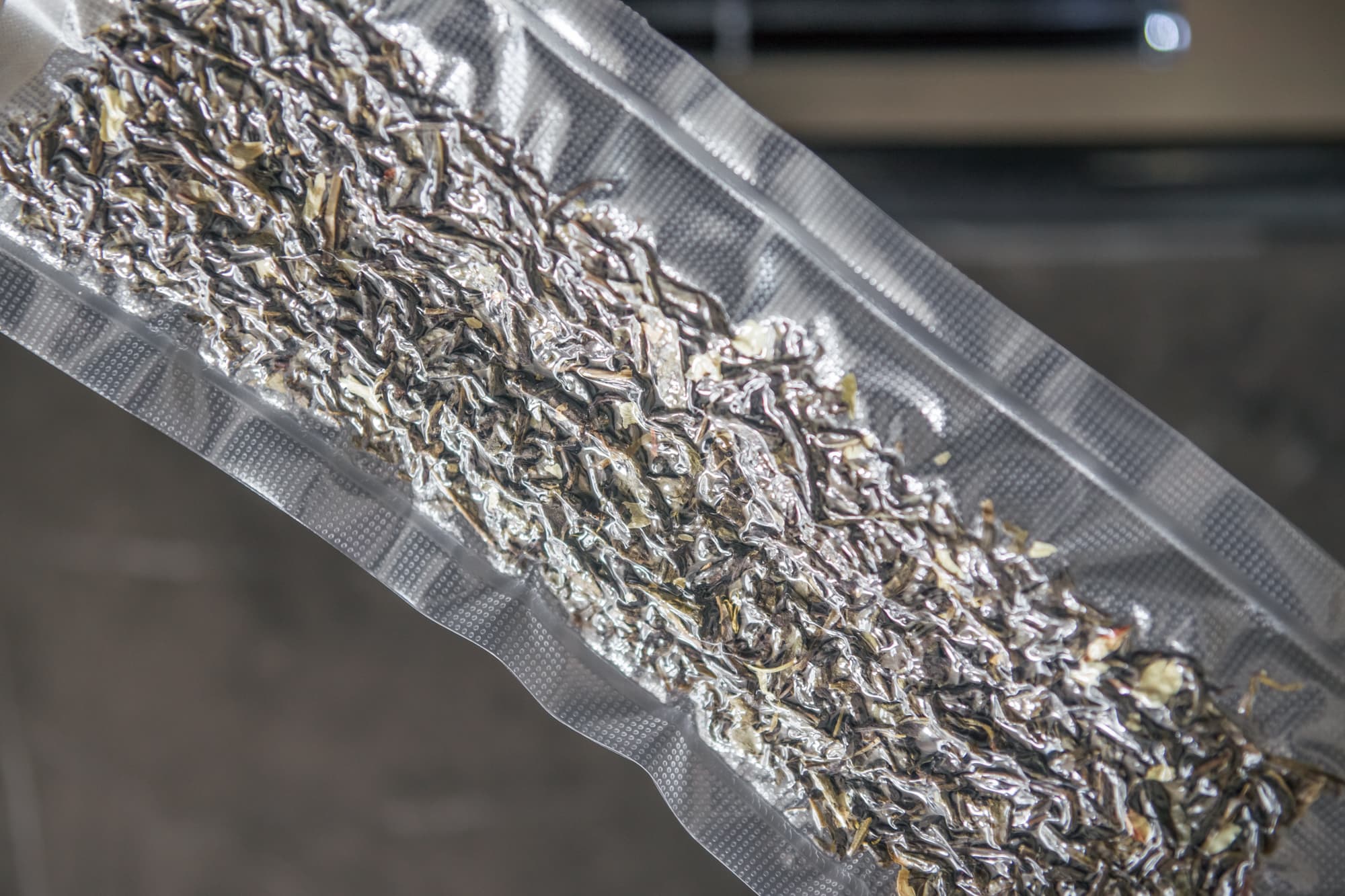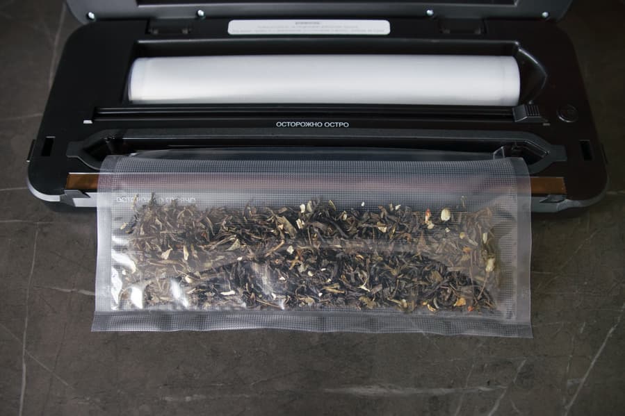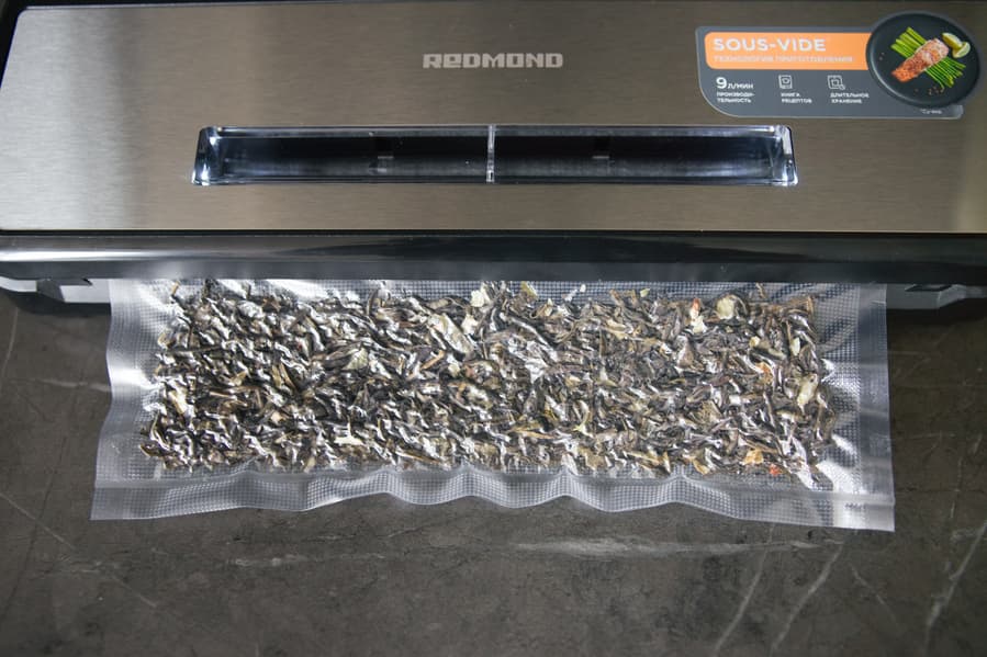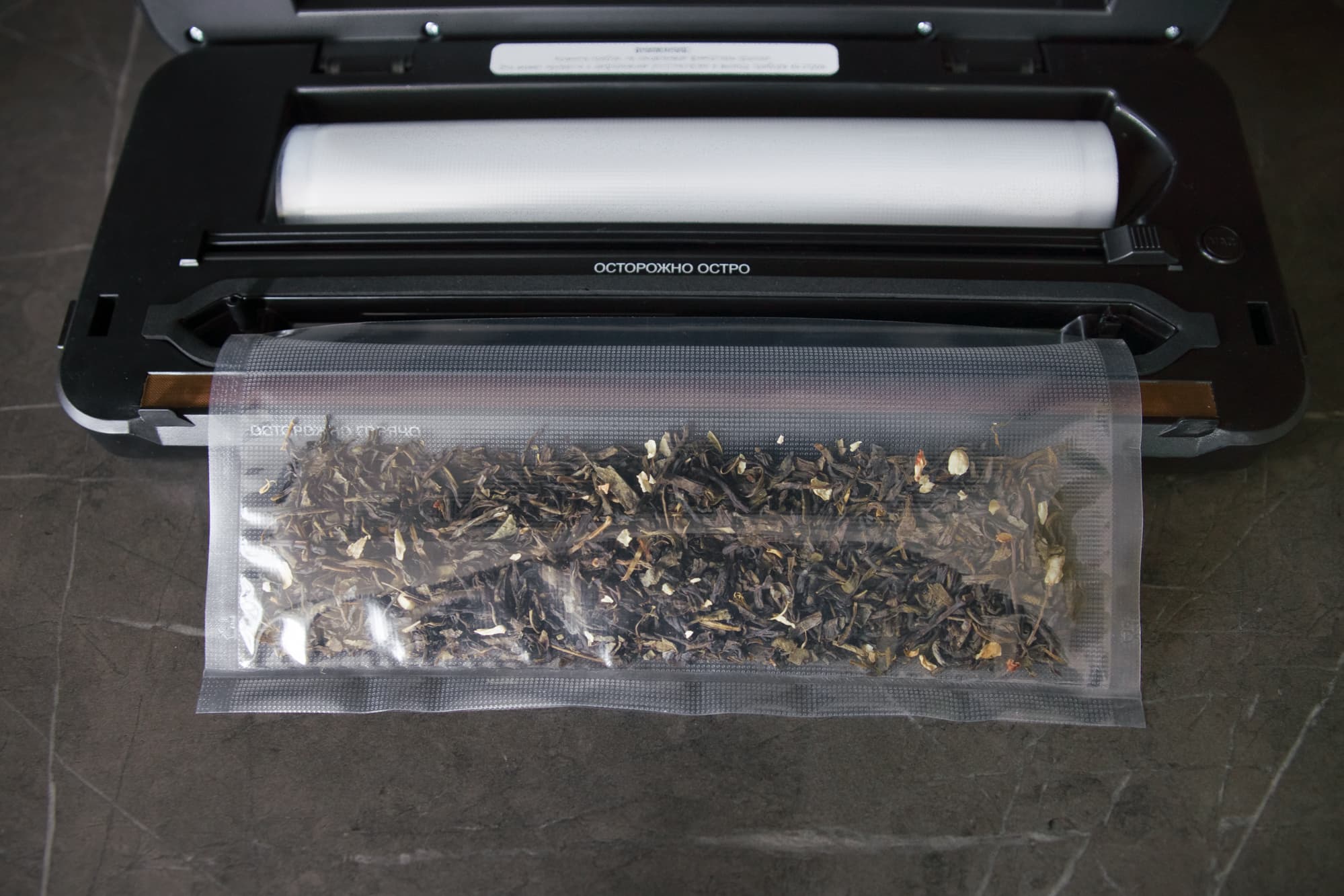 Чай всыпали в пакет, перед размещением в камере разровняли содержимое, защелкнули крышку и запустили режим для сухих продуктов.
