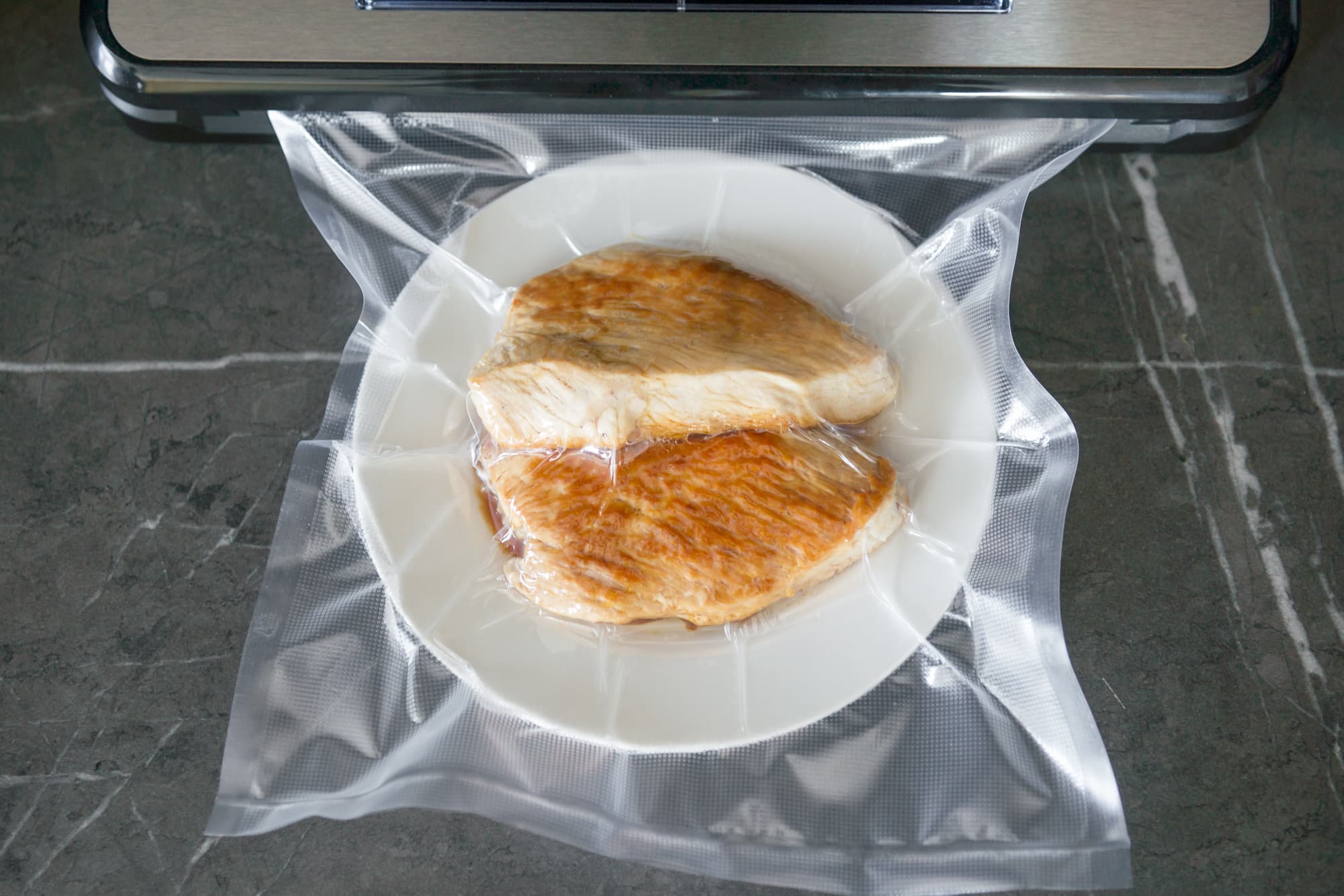 Когда наготовил так много, что сразу всё не съесть и хочется сохранить блюдо сочным и свежим подольше, вакууматор поможет, как ничто другое. Еда уже была на тарелке, и мы решили так ее и завакуумировать, благо ширина пакета позволяет. Режим был выбран Влажный.