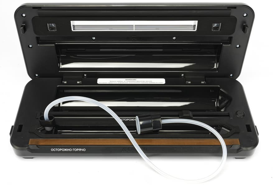 У самого края расположена запаивающая термолента, рассчитанная на пакет шириной до 28 см. Прямо над лентой на крышке — съемная уплотнительная лента из силикона, обеспечивающая герметичность.