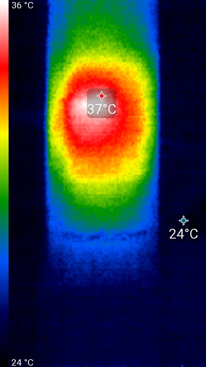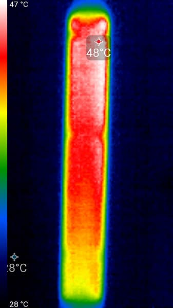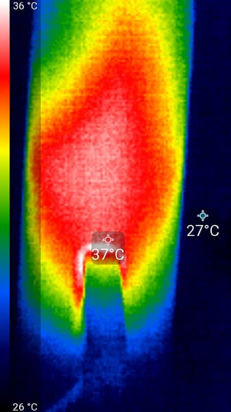 После продолжительной работы лампы Remilicht LA-H688 на максимальной яркости и с подключенной нагрузкой к USB-порту (см. ниже) нагрев лампы умеренный (температура в помещении примерно 23 градуса). Максимум температуры — на осветительном блоке (снимок сверху):