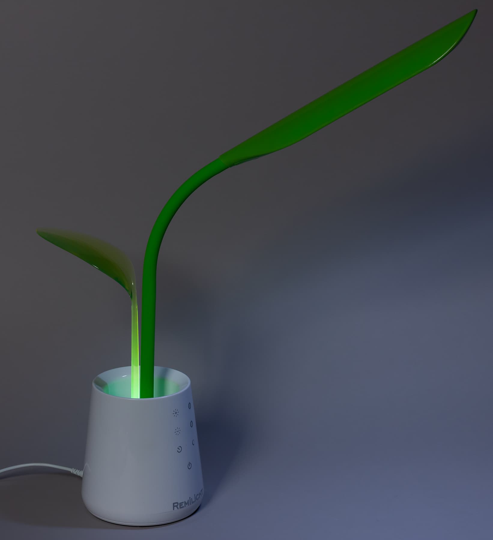 Ночник реализован в виде подсветки торца стебля листика, выполненного из прозрачного, но слегка замутненного и тонированного светло-зеленым пластика. В режиме ночника освещается внутренняя часть основания и стебель листа с постепенным снижением яркости от начала стебля к концу листика.