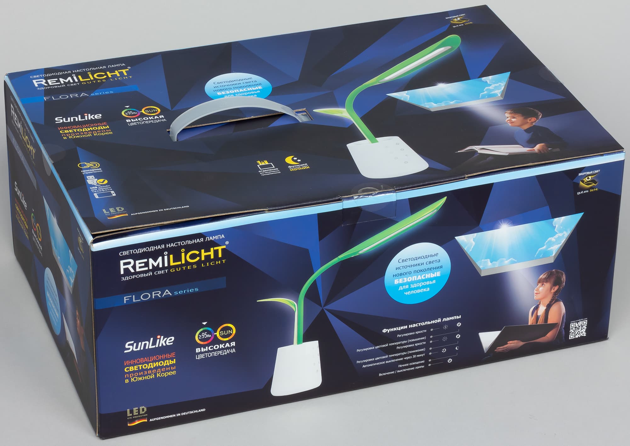 На гранях коробки приведено много информации — изображения самой лампы, основные особенности, функции и т. д. Есть даже спектр этой лампы в сравнении со спектром «обычной лампы».