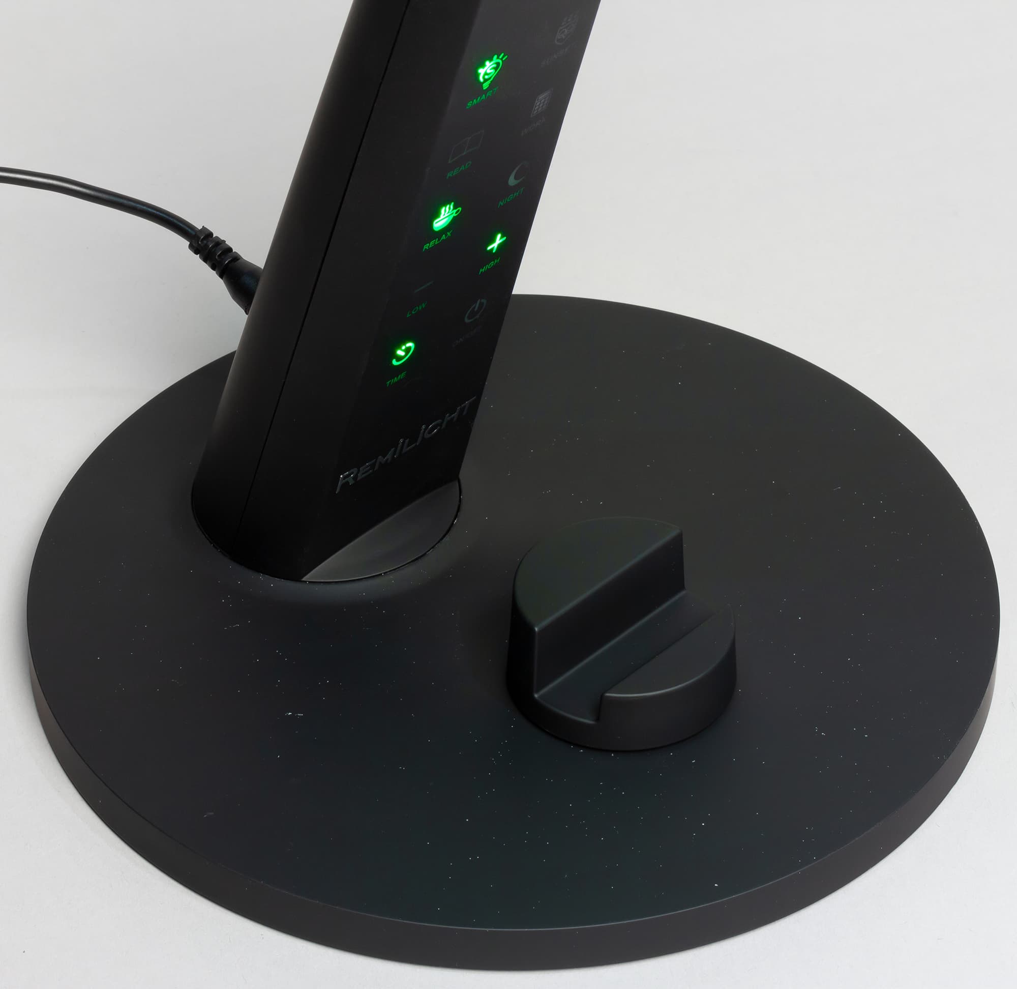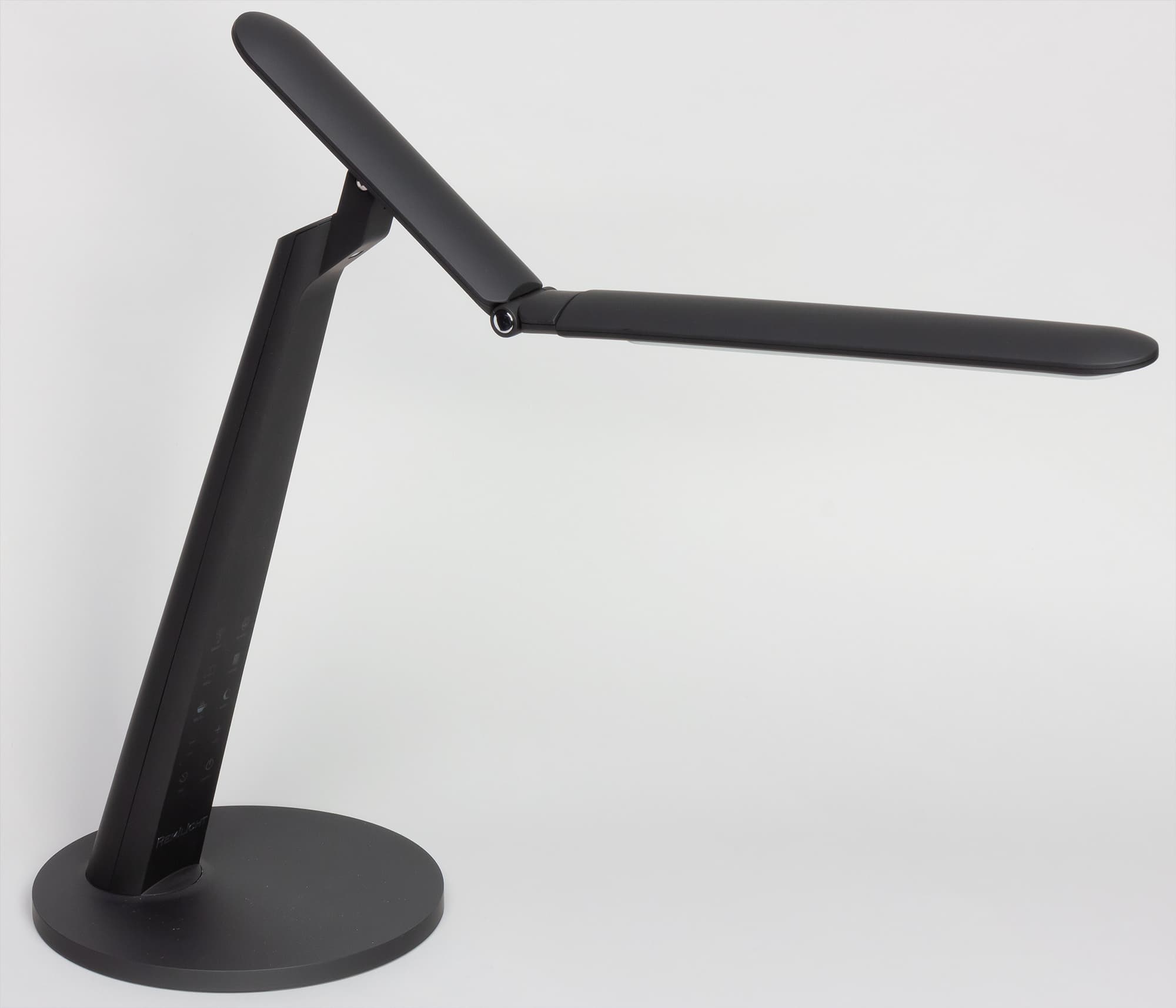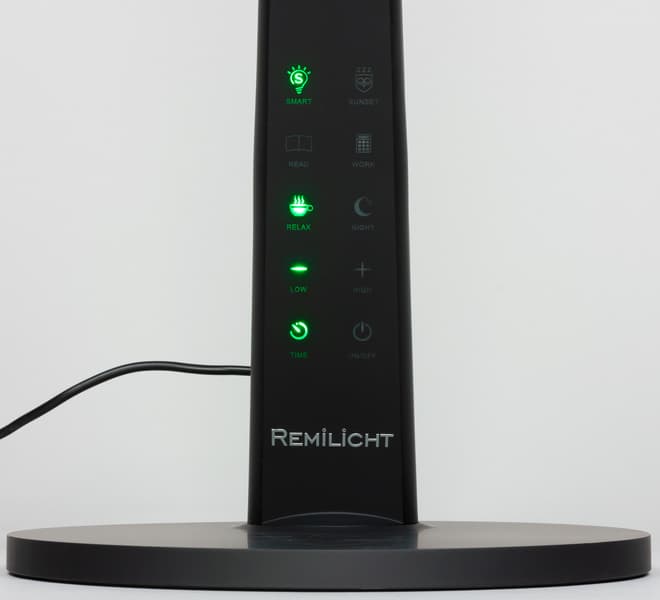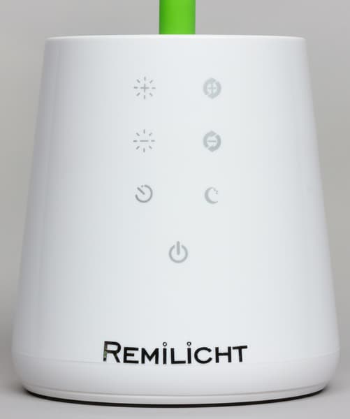 Спереди на грани стойки расположены несколько сенсорных кнопок. Значки на кнопках подсвечиваются зеленым, кроме кнопки питания — ее значок подсвечивается синим. Когда лампа подключена к сети, но выключена, значок питания светится, что позволяет без проблем включить лампу в полной темноте. Далее зеленым подсвечиваются только значки активных в данный момент функций или значки «+» или «−», когда достигнуты пределы по регулировки яркости. Тут есть небольшой эргономический просчет, так как в неподсвеченном состоянии значки бледноваты и кнопки сложно распознать, особенно в полутьме.