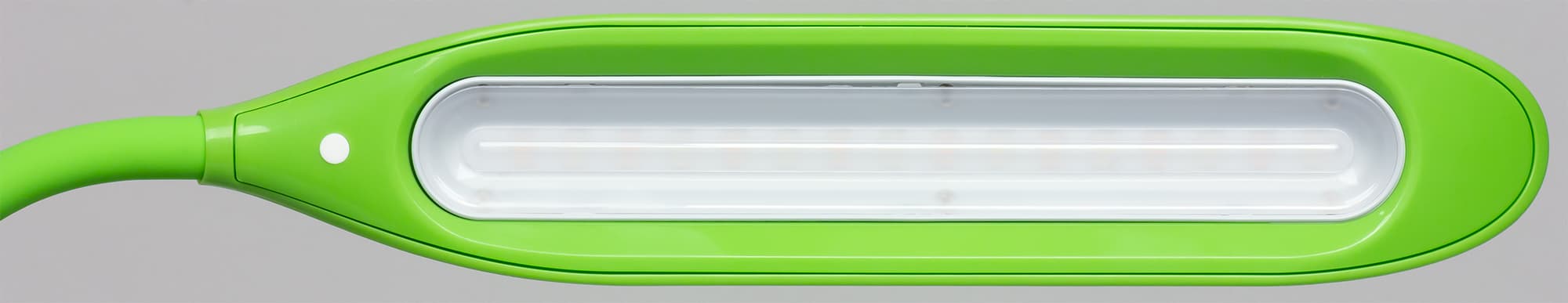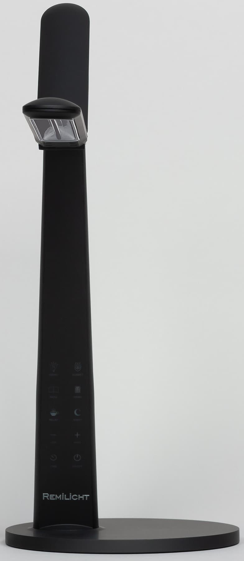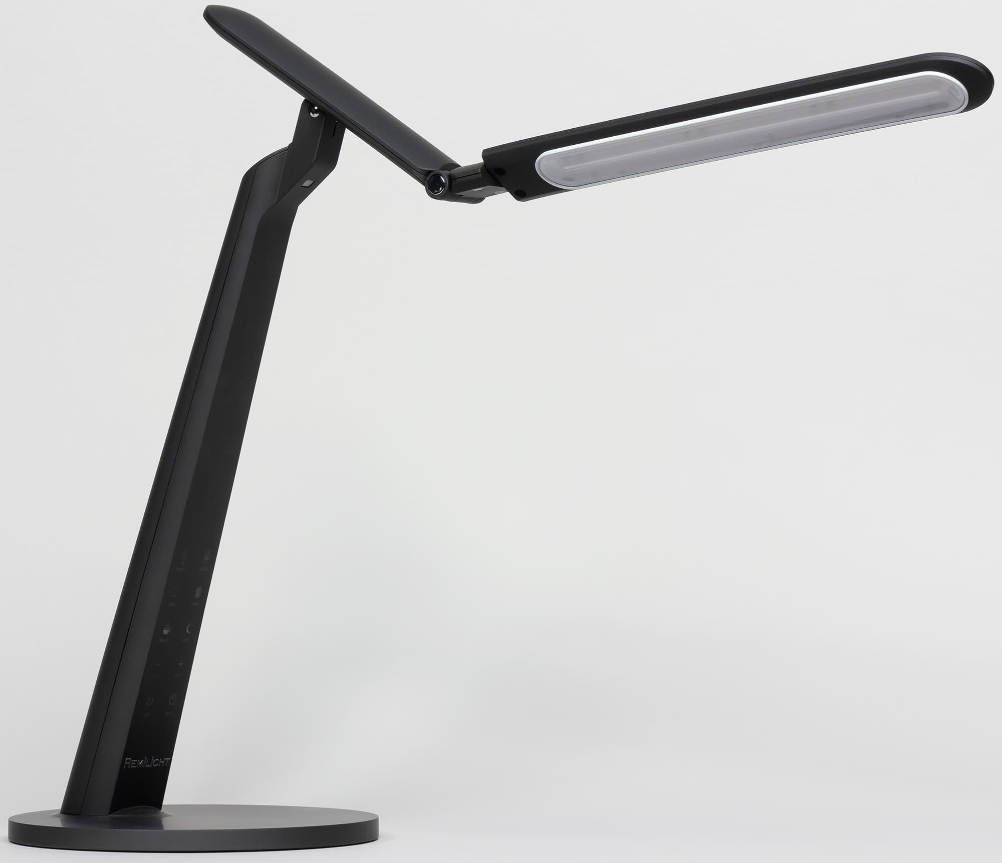 Спереди на грани стойки расположены несколько сенсорных кнопок. Значки на кнопках подсвечиваются зеленым, кроме кнопки питания — ее значок подсвечивается синим. Когда лампа подключена к сети, но выключена, значок питания светится, что позволяет без проблем включить лампу в полной темноте. Далее зеленым подсвечиваются только значки активных в данный момент функций или значки «+» или «−», когда достигнуты пределы по регулировки яркости. Тут есть небольшой эргономический просчет, так как в неподсвеченном состоянии значки бледноваты и кнопки сложно распознать, особенно в полутьме.
