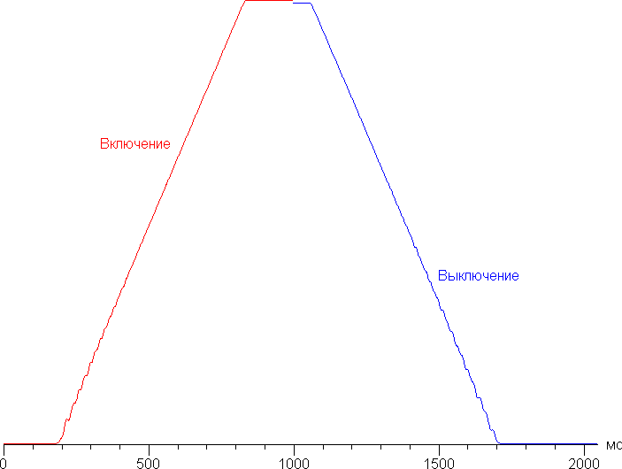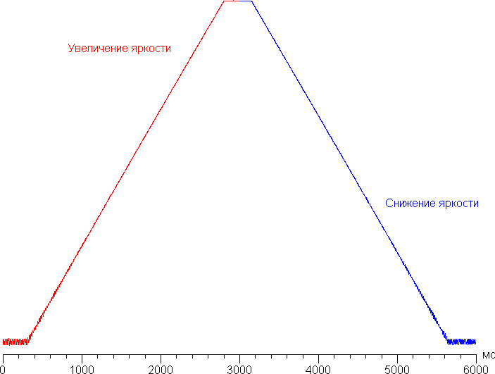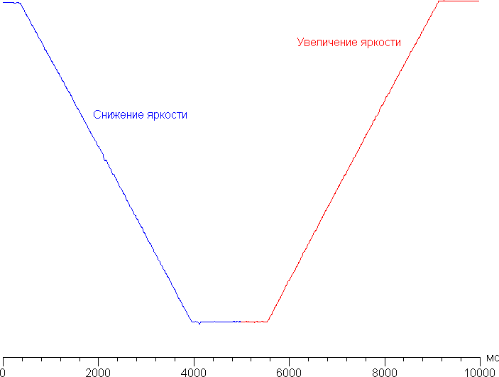 Максимум яркости достигается, а выключение происходит за примерно 640 мс, видимых глазом ступенек в изменении яркости нет. При удержании кнопок яркость также меняется плавно и без видимых ступенек. Процесс в одну сторону занимает порядка 2,5 с: