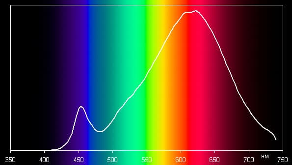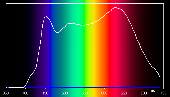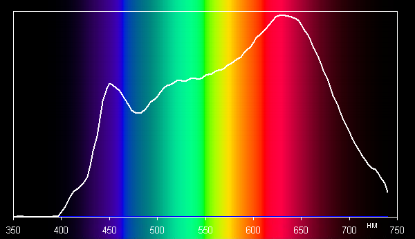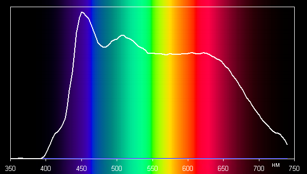 Значения цветовой температуры, ΔE и Ra, а также спектры ниже приведены для максимальной яркости, впрочем, отличия от характеристик для минимальной яркости несущественные.
