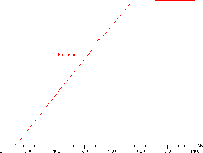 При включении лампы Remilicht LA-H688 яркость растет плавно, но быстро, где-то за 850 мс она достигает максимума, ступенек на зависимости яркости от времени нет (один выброс не считается). Для глаз такой рост приятен.