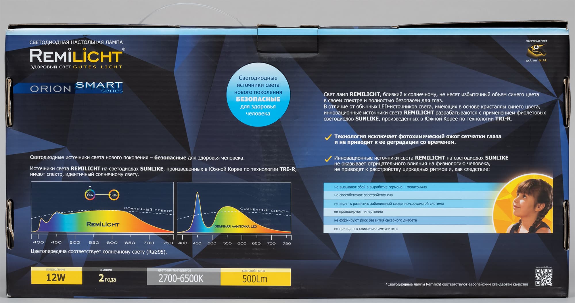 Так как никакого УФ-излучения в спектре обычных ламп, даже в тех, в светодиодах которых используется синий излучатель и желтый люминофор, нет, то из возможного вреда человеку остается только яркий свет перед сном. Суть в том, что на ярком свету у человека подавляется выработка мелатонина (гормона, который управляет усталостью человека и потребностью его во сне), что может приводить к нарушению суточного (циркадного) ритма и прочим неприятным последствиям. Чем ярче свет и чем света больше в синей области (400—500 нм), тем подавление выработки мелатонина больше. Поэтому снижение интенсивности синего позволит немного увеличить безопасный уровень яркости. Также, скорее психологически, чем физиологически, для глаз приятнее свет с высоким индексом цветопередачи, когда освещаемые лампой предметы имеют естественный для них цвет. На этом обсуждение безопасности для здоровья человека мы закончим, оставив все остальные утверждения на совести производителя ламп Remilicht.