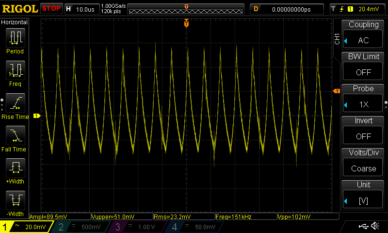 Простая нагрузка в виде последовательно соединенных резисторов с сопротивлением примерно 5 и 10 Ом показала хорошую нагрузочную способность USB-порта на лампе Remilicht LA-H688 — при токе 1,45 А напряжение составило 5,04 В, а пульсации были незначительным (размах порядка 0,1 В при частоте пульсаций 150 кГц):