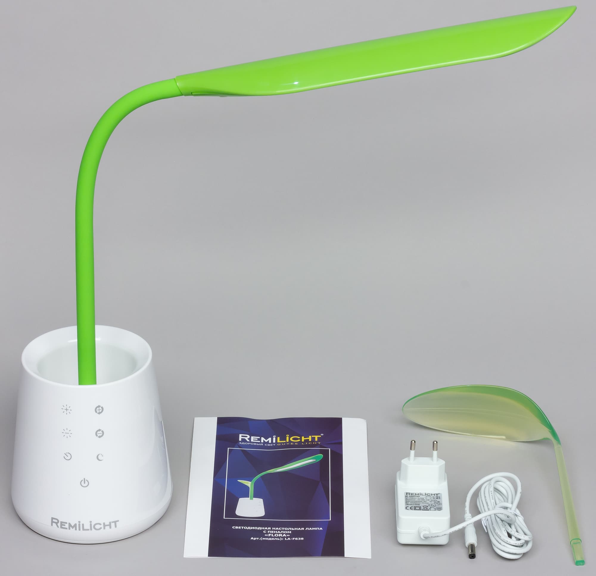 Комплект поставки включает в себя лампу, лист — светорассеиватель ночника, адаптер питания и руководство пользователя на русском языке, совмещенное с гарантийным талоном.