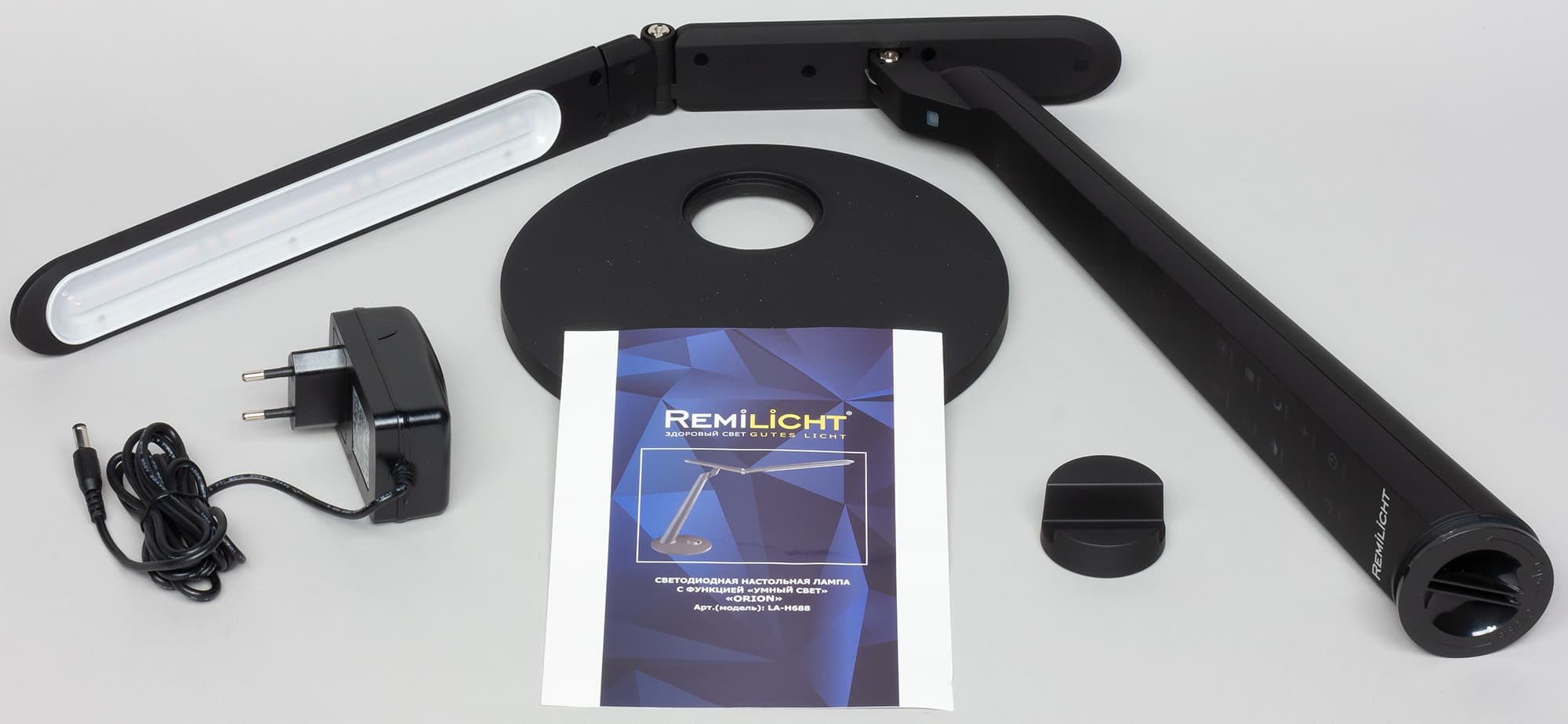 Для защиты и распределения содержимого используются вставки из гофрированного картона, коробочка из такого же материала, пластиковые пакеты пупырчатые и обыкновенные. Комплект поставки включает в себя лампу на стойке, круглое основание, подставку для телефона, адаптер питания и руководство пользователя на русском языке, совмещенное с гарантийным талоном.