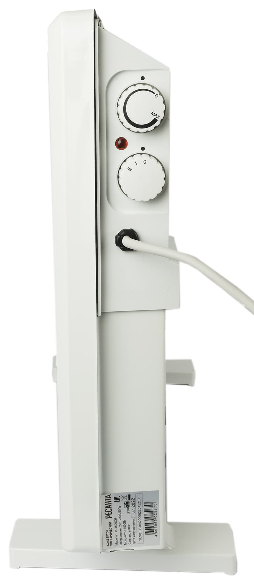 Справа — пластиковая накладка с панелью управления — две механические ручки и светодиодный индикатор. Под ними расположено место вывода шнура питания. В нижней части — наклейка с технической информацией.