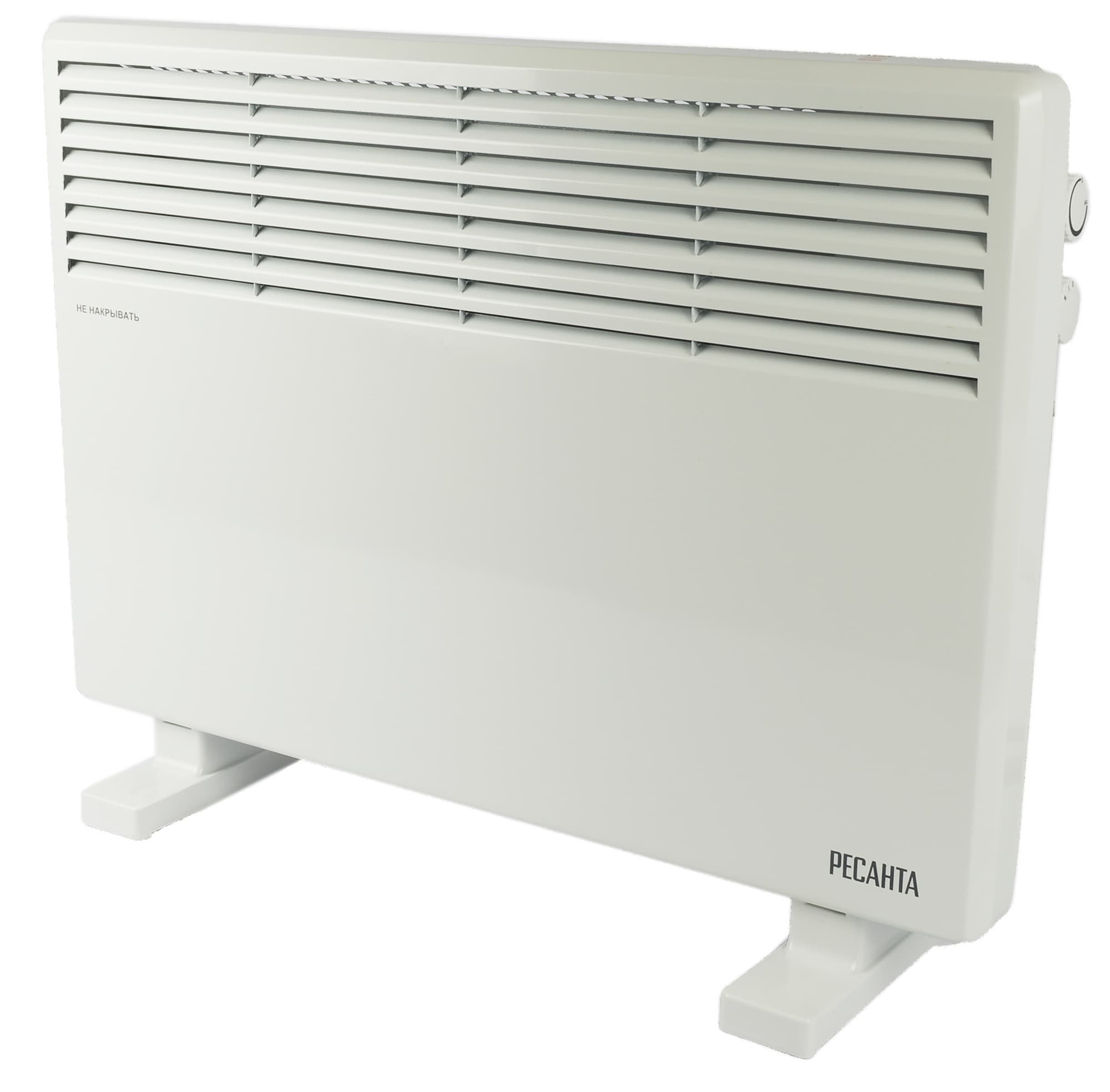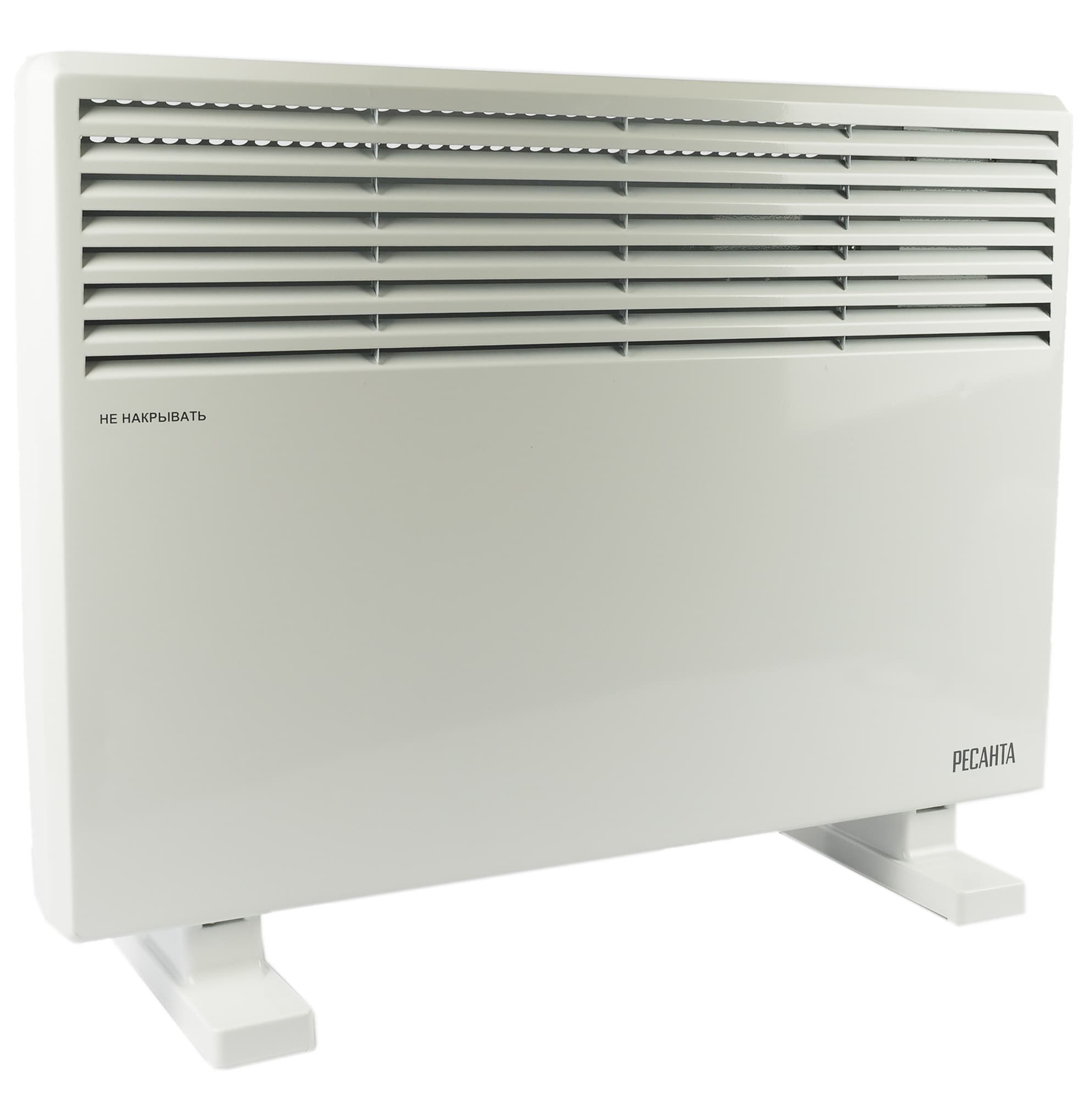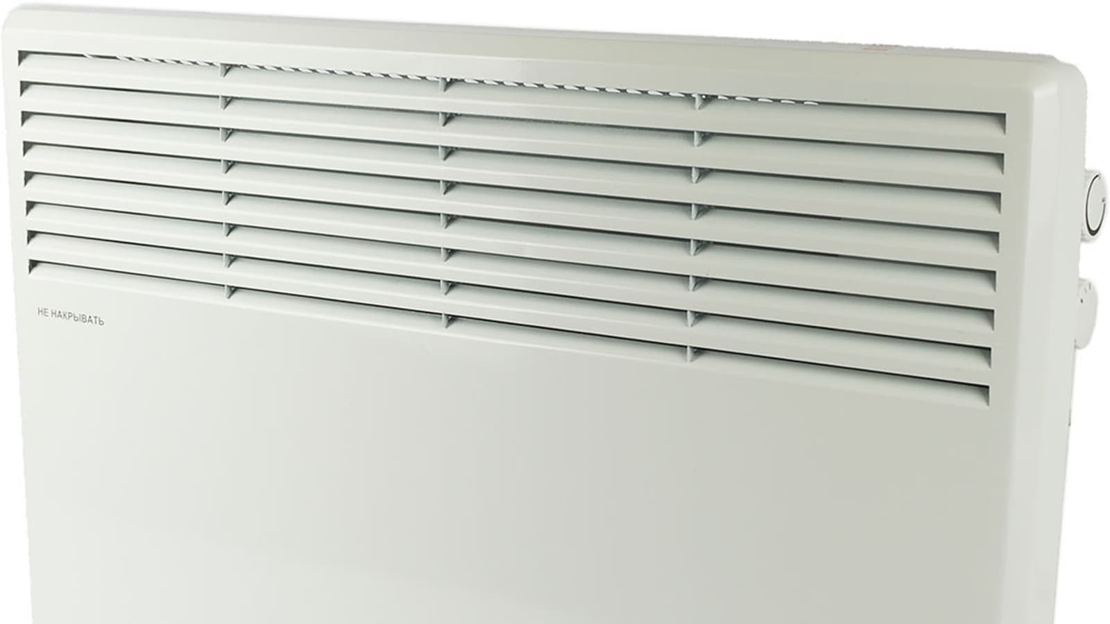 Спереди у прибора мы видим логотип (в нижнем правом углу). Слева — предупреждение о том, что обогреватель нельзя накрывать. В верхней части — решетка для выхода воздуха.