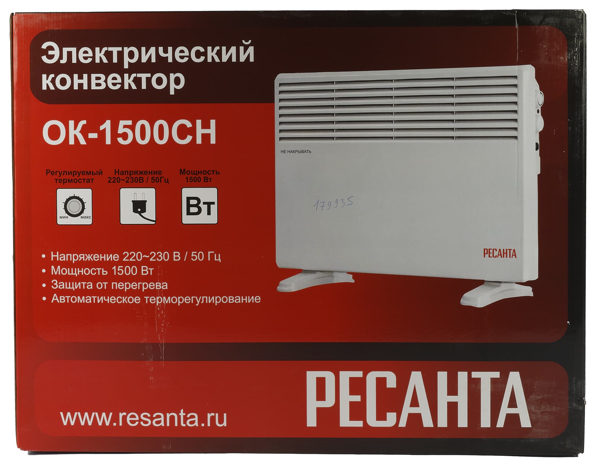 Обогреватель поставляется в объемной картонной коробке, оформленной в ярких цветах — используются красный и бордовый оттенки. На лицевой стороне мы видим фотографию прибора, а также его основные особенности и технические характеристики.