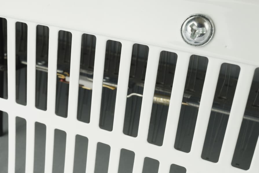 Кстати, тут мы можем увидеть прорези для забора холодного воздуха снизу обогревателя, а сквозь них — нагревательный элемент типа ститч, представляющий собой металлическую нить, уложенную зигзагом.