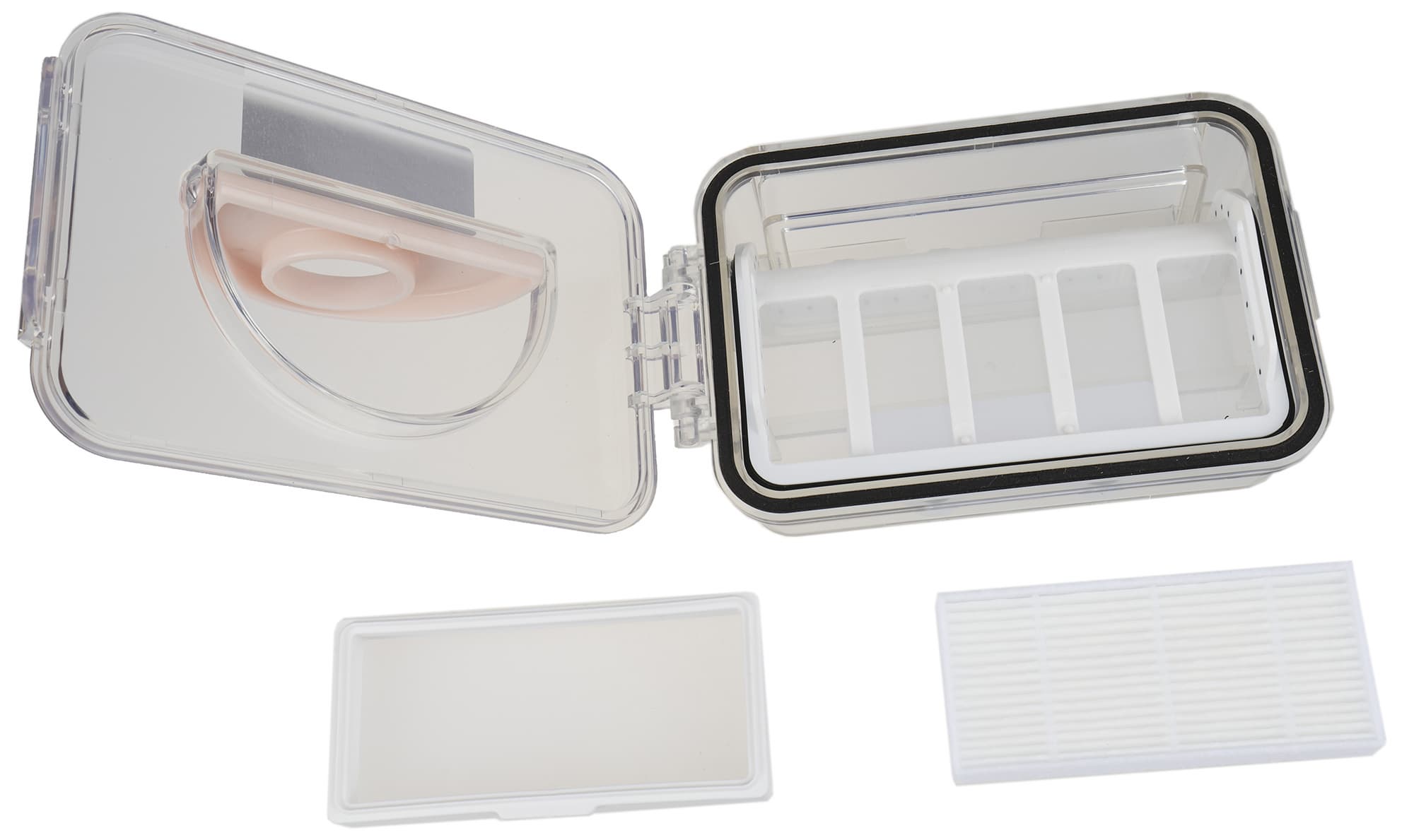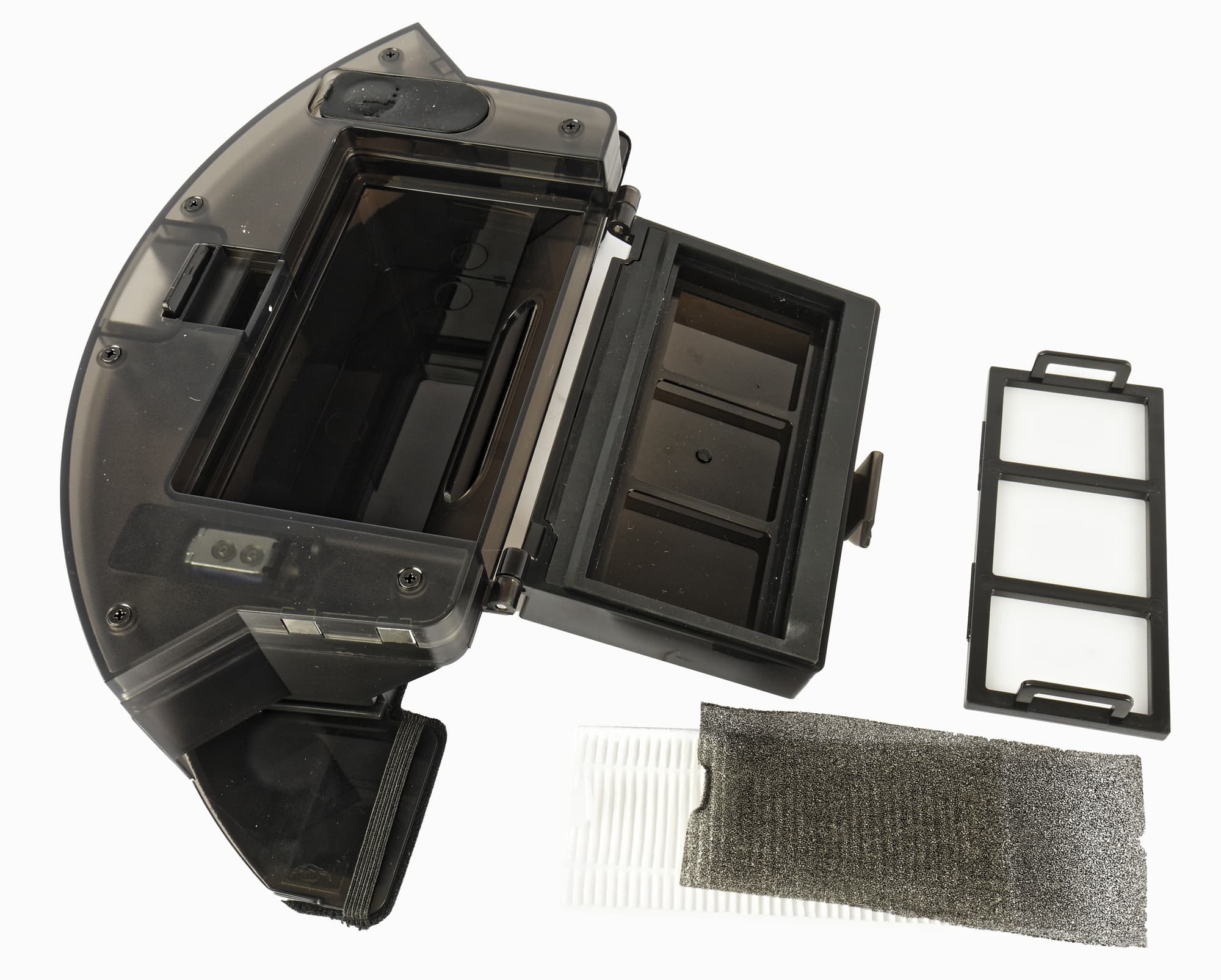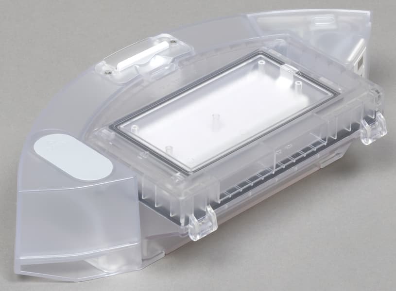 Модуль для сухой и влажной уборки состоит из небольшого мусоросборника объемом 250 мл и резервуара для воды (220 мл). В верхней части контейнера находится прямоугольный HEPA-элемент. Он защищен мелкой капроновой сеткой, играющей роль предварительного фильтра.