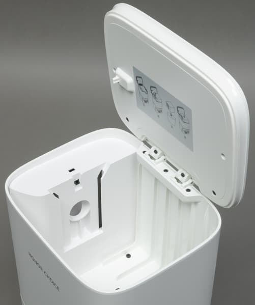 Как водится, пыль и мусор удаляются из мусоросборника робота с помощью пневматики: для этого предназначен воздушный насос внутри базы. В верхней части базы находится светодиодный индикатор состояния. Высасываемые из робота отходы поступают в основной контейнер, где попадают в тканевый мешок, закрепленный в емкости с помощью пластиковой рамки.
