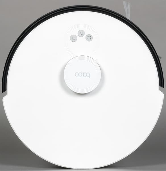 После распаковки перед нами предстал почти что классический робот-пылесос. Форма, как и у большинства подобных устройств, круглая. По центру (чуть со смещением вперед) возвышается башенка лидара, на ней нанесен логотип Tapo.