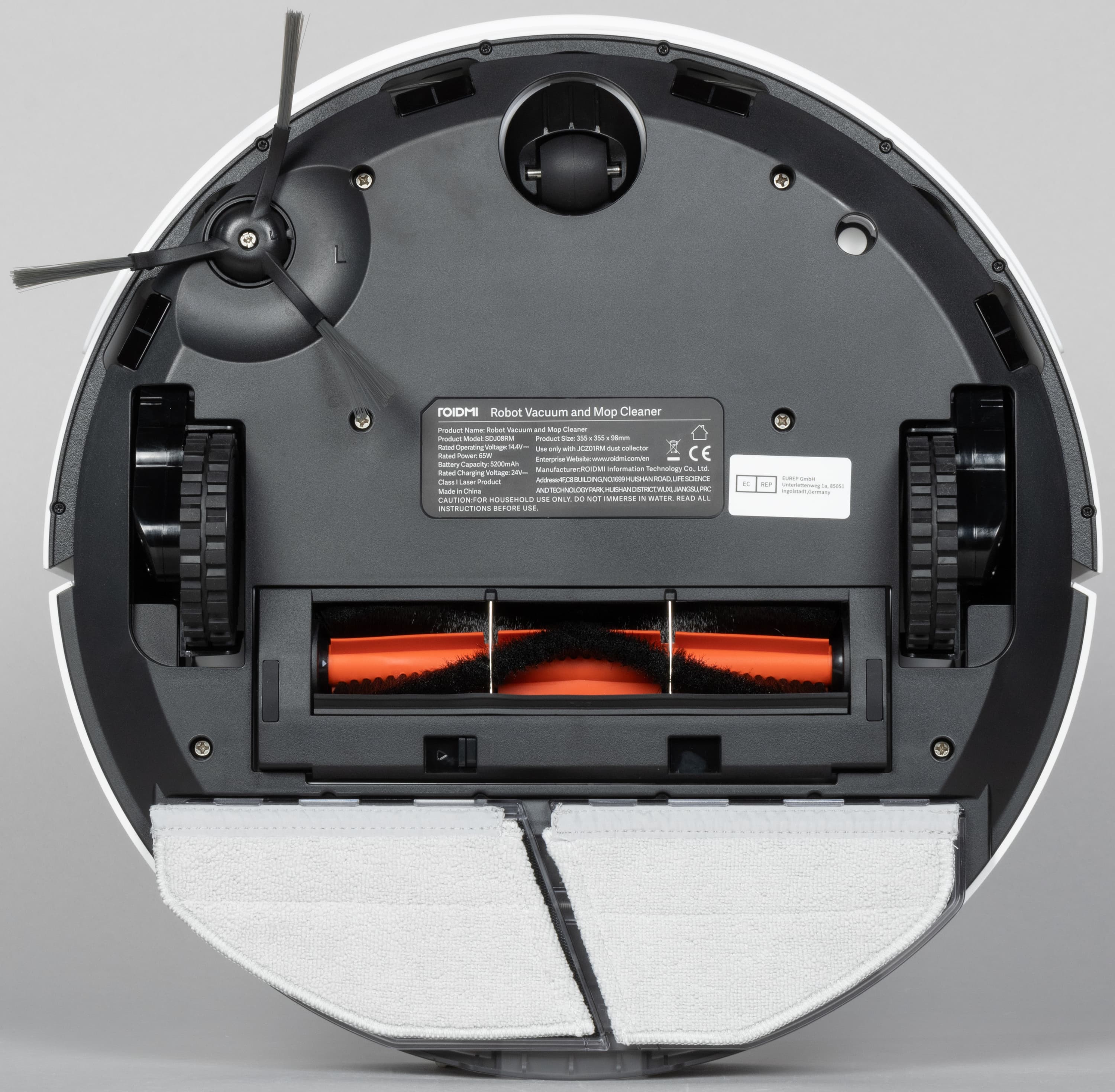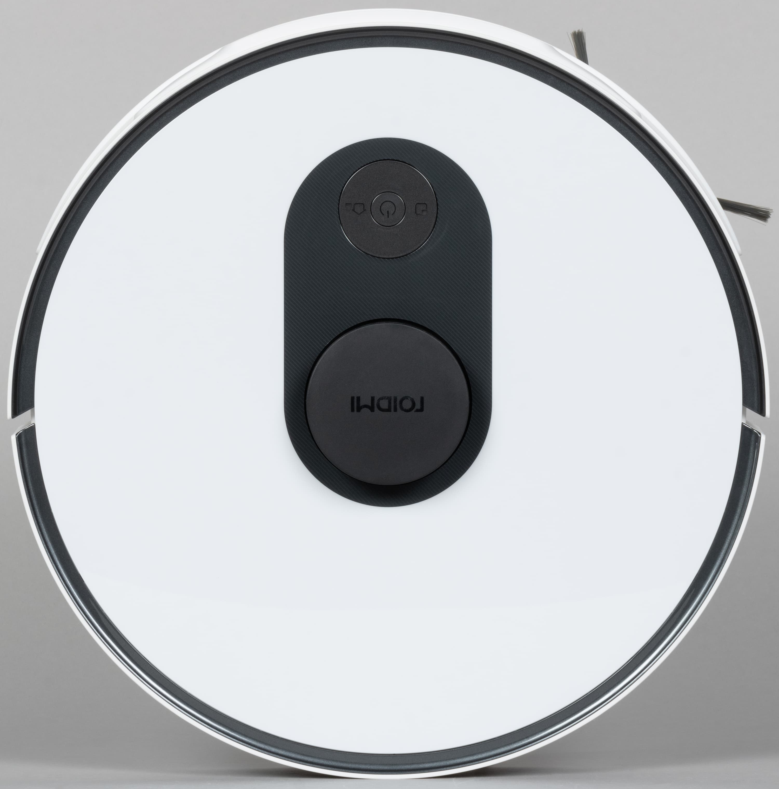 На верхней панели робота мы видим три кнопки для управления устройством. Они же служат для сопряжения робота с мобильным приложением (Roidmi или Mi Home). Также на верхней стороне возвышается башенка лидара с логотипом Roidmi. Больше сверху никаких элементов, заслуживающих внимания, не обнаружилось.