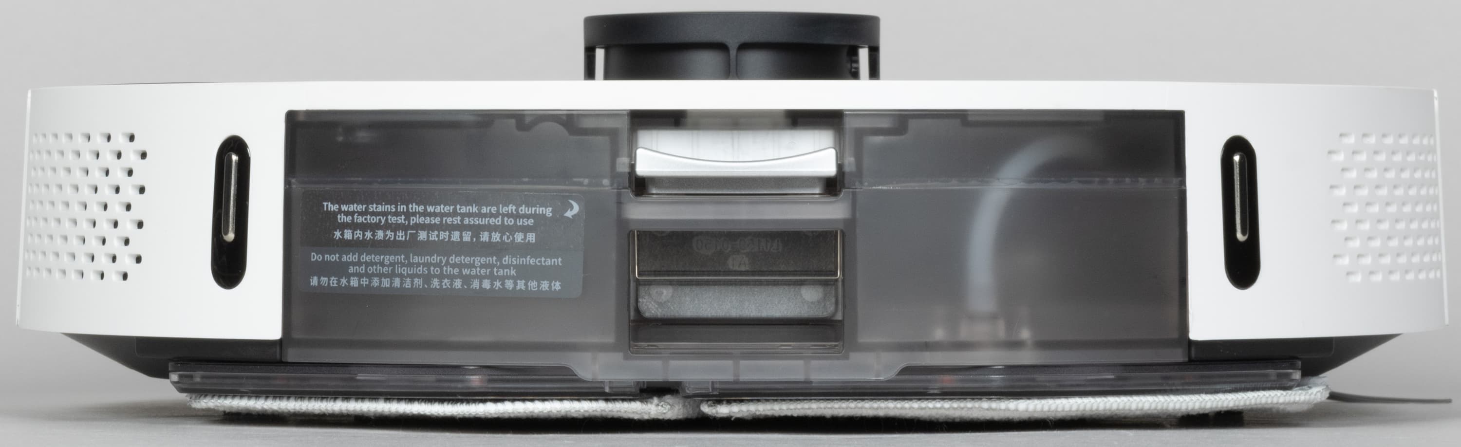 С тыльной стороны мы видим контакты для зарядки устройства и установленный комбинированный контейнер для сухой и влажной уборки.