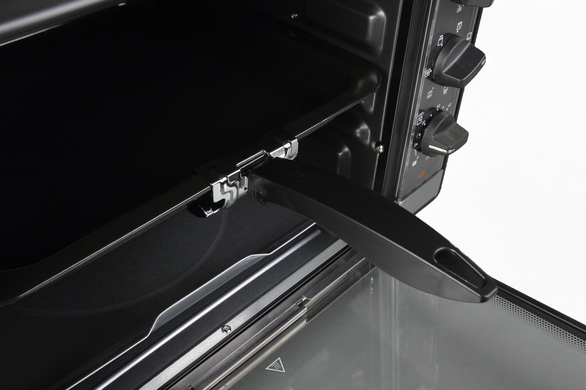 Разнообразные режимы работы позволяют решать большинство задач, для которых предназначены духовые шкафы. Диапазон температур также представляется достаточным и для выпечки изделий из теста, и для длительно готовящихся блюд, и для запекания на гриле и вертеле. Устройство может работать как с автоматическим отключением, так и в ручном режиме. Нагревается до 200 °C печь довольно быстро — за пять минут. При ее эксплуатации следует, конечно, соблюдать определенные требования безопасности, т. к. в ходе работы нагреваются внешние поверхности. Этот факт следует учитывать при выборе места для установки прибора и его эксплуатации, чтобы не обжечься при случайном касании. При этом регуляторы на панели управления и ручка дверцы никогда не нагреваются, так что открывать духовку, переключать режимы, изменять температуру и время работы можно незащищенными руками.